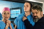 FassadenDr. Leyla Sherbaz (Sanam Afrashteh, l.) und Dr. Theresa Koshka (Katharina Nesytowa, M.) beschleicht der Verdacht, dass Katies (Valeria Eisenbart, v.) Mutter, Viola Wetzel (Sanne Schnapp, r.) ihnen etwas verschweigt.Bild: © MDR/Jens Ulrich Koch