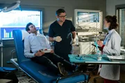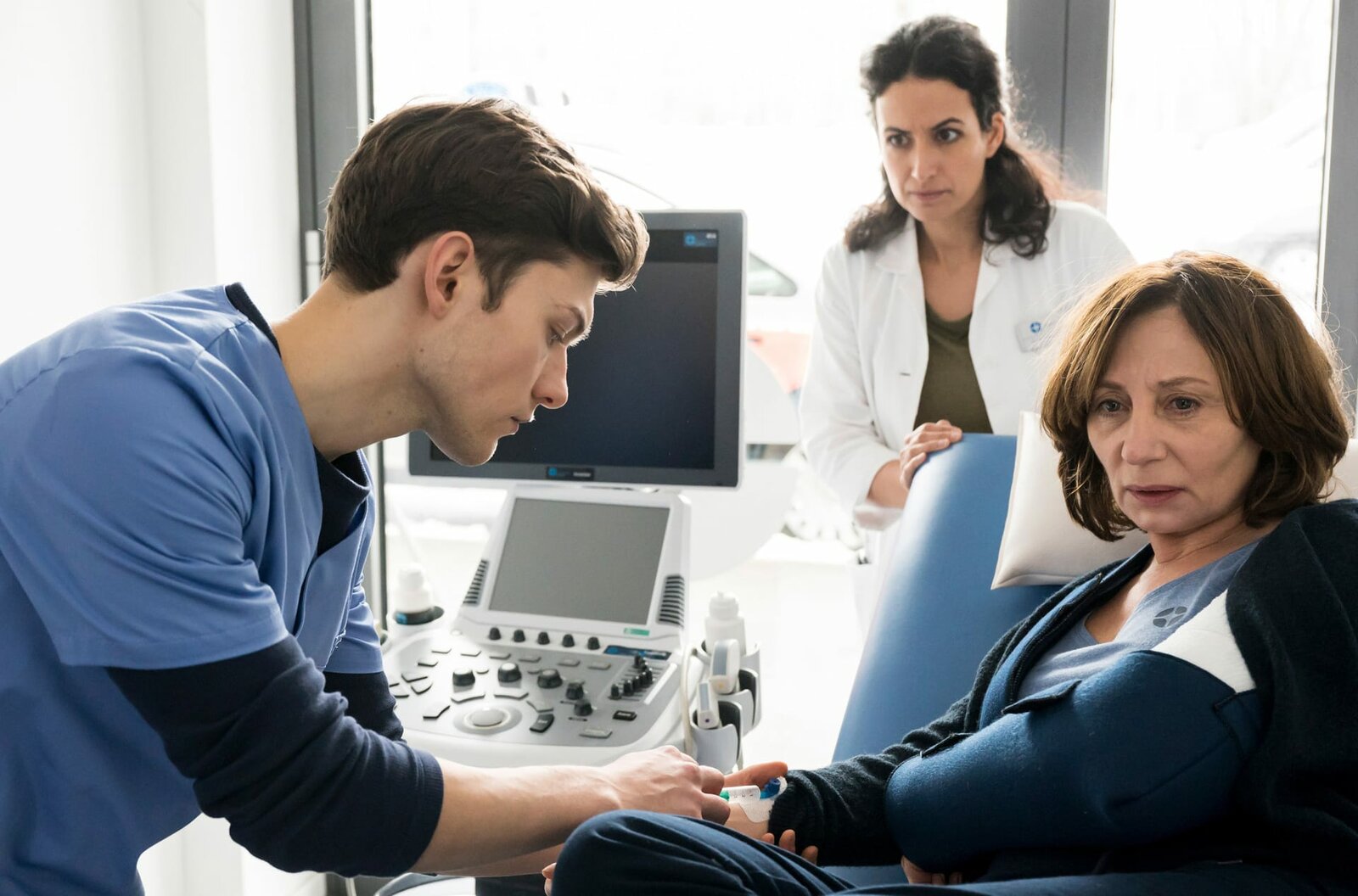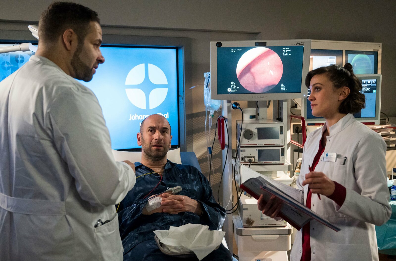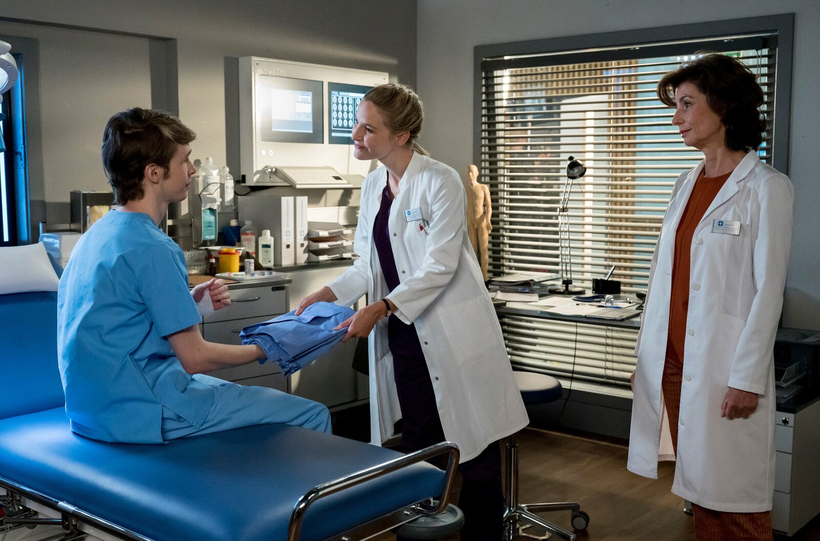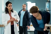 VergissmeinnichtEs gibt einen Neuzugang am Johannes-Thal-Klinikum: Assistenzarzt Florian Osterwald (Lion Wasczyk, l.) darf, unter der Aufsicht von Leyla Sherbaz (Sanam Afrashteh, h.) seine erste Patientin untersuchen. Alina Petrowa (Marina Weis, r.) ist von der Treppe gestützt, kann sich aber nicht mehr daran erinnern.Bild: © ARD/Jens Ulrich Koch