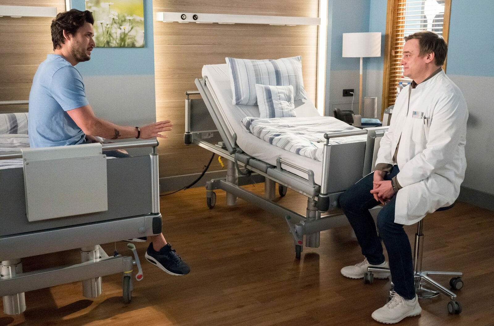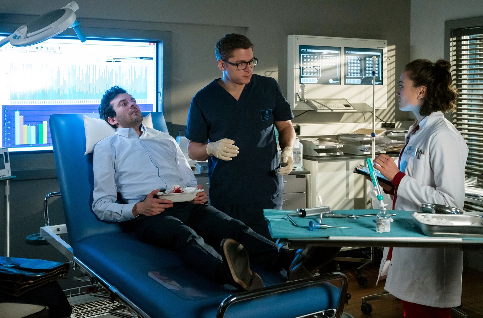 KonfrontationMatteo (Mike Adler, l.) erklärt Rebecca (Milena Straube, r.) wie es zu den unklaren Symptomen und Werten bei Jürgen Wimmer (Urs Jucker) kommen kann.Bild: © ARD/Jens Ulrich Koch