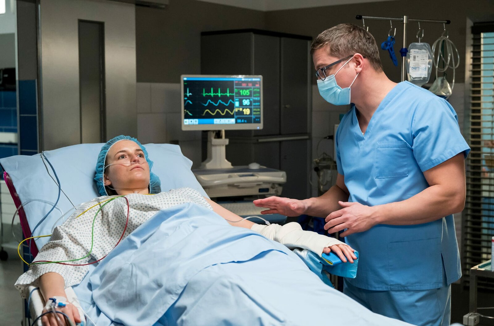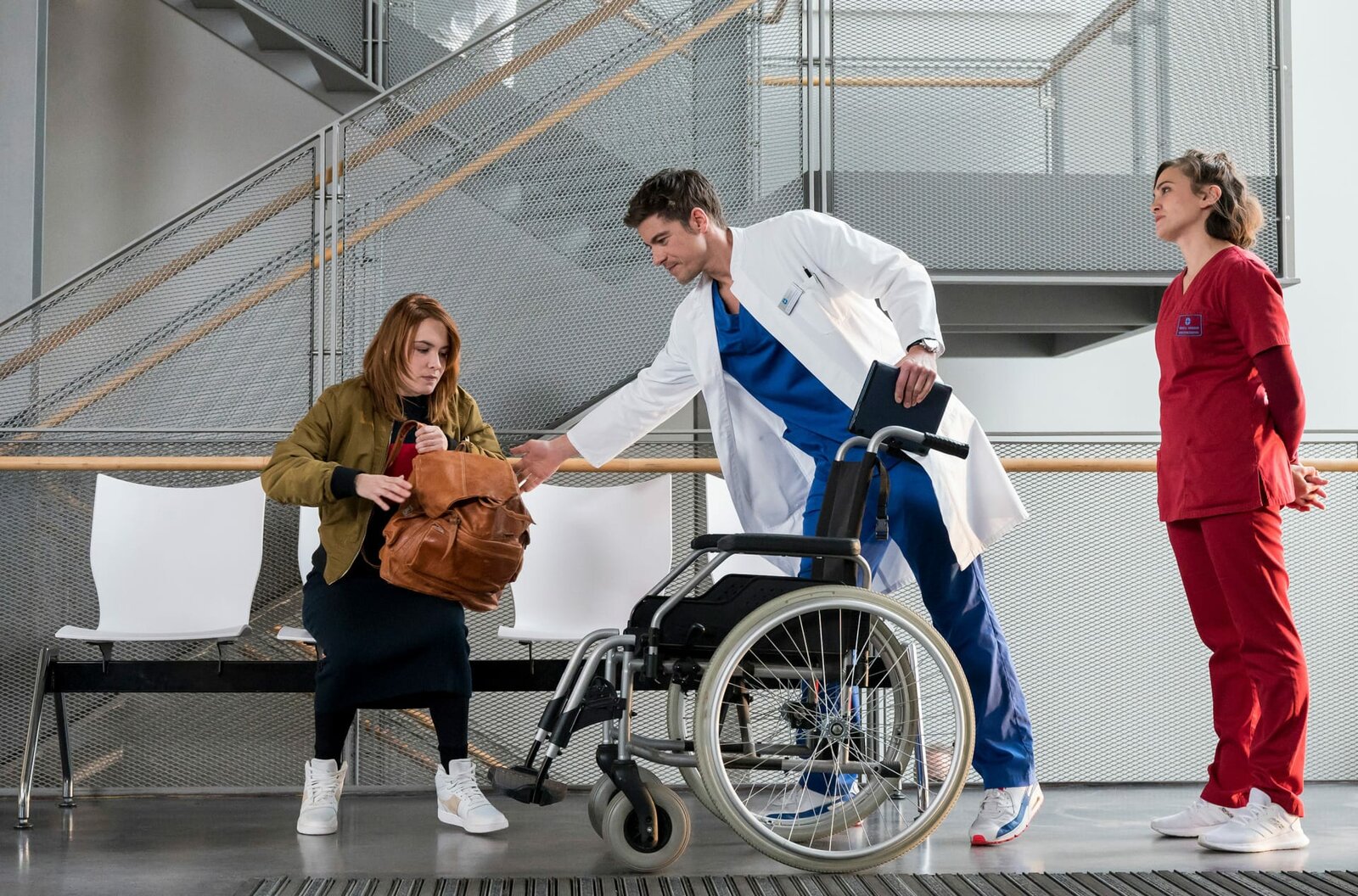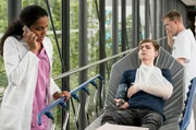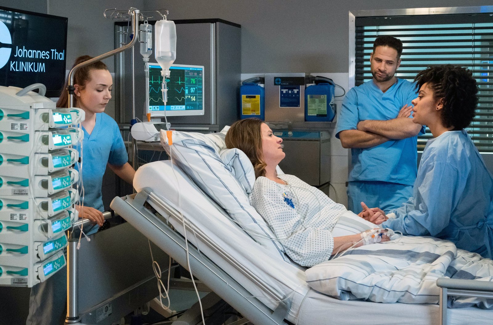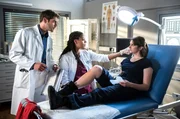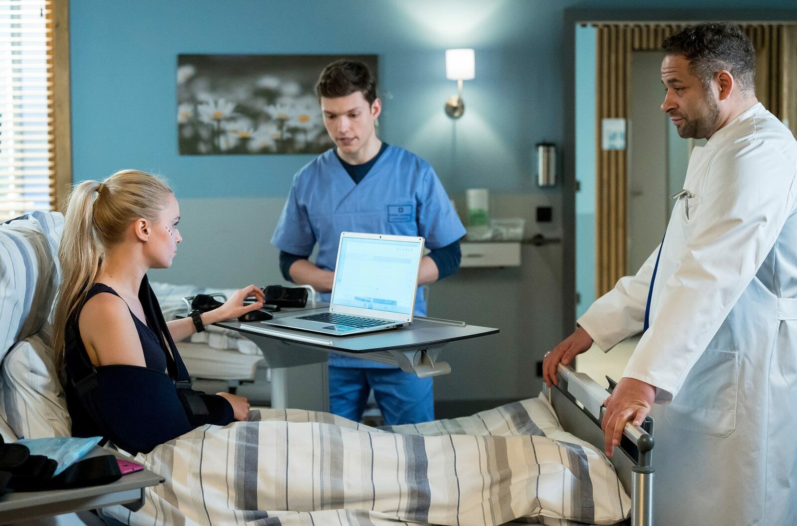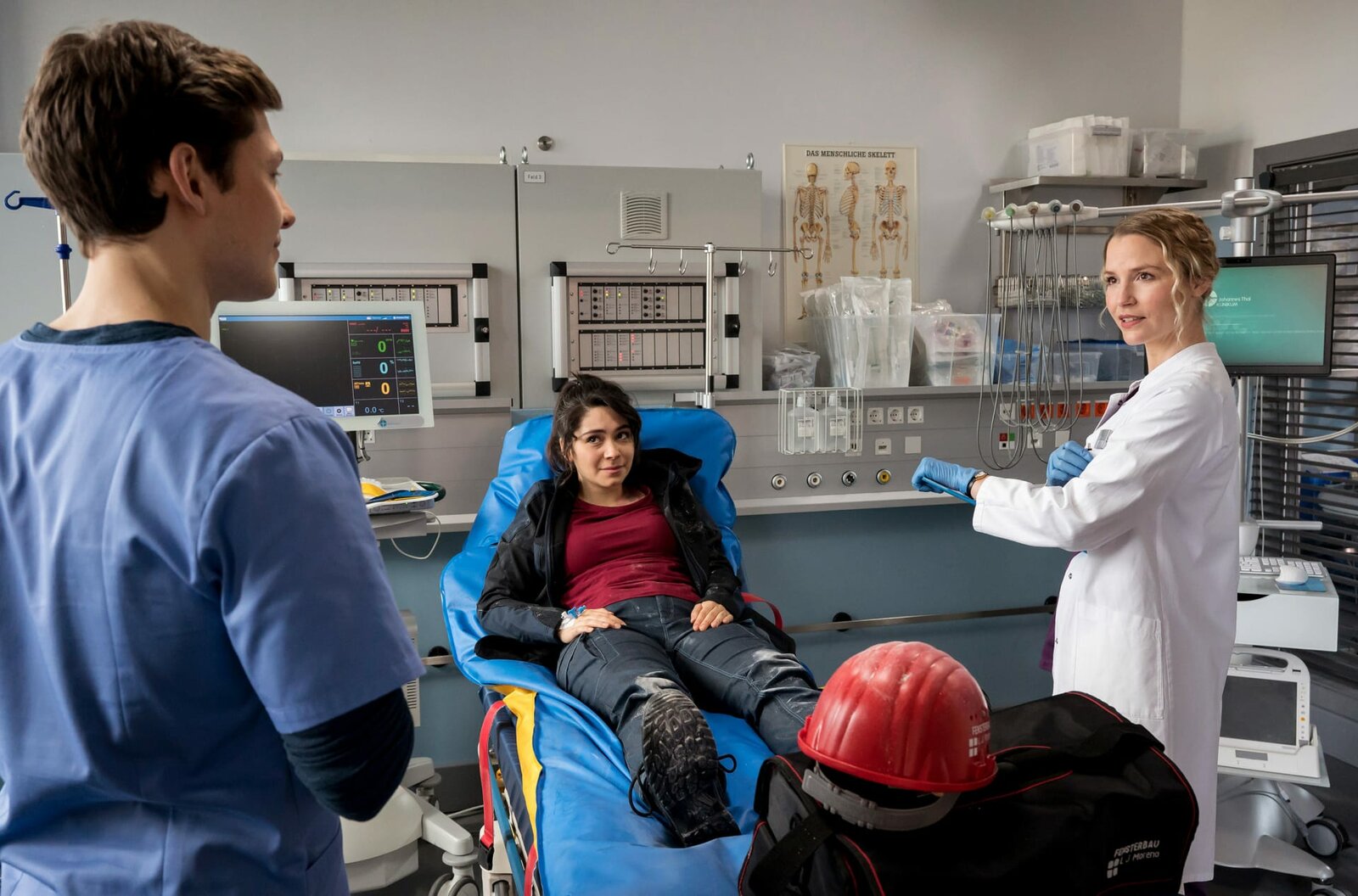 Doppelte GefahrDie Fachärzte Julia Berger (Mirka Pigulla, r.) und Florian Osterwald (Lion Wasczyk, l.) nehmen Lara Moreno (Tamara Romera Ginés, M.) auf, die von einem Baustellenauto gestürzt ist und sich zwei Rippen und das Schlüsselbein gebrochen hat.Bild: © ARD/Jens-Ulrich Koch