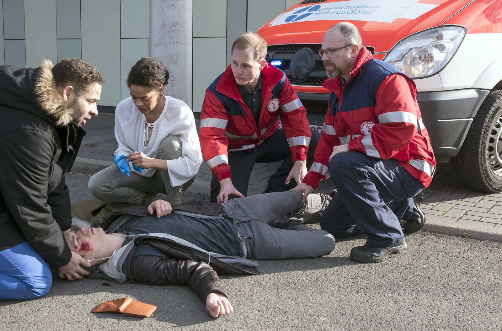 Milan Pavlovics (Manuel Krstanovic, v.) Zustand wird immer schlechter. Dr. Marc Lindner (Christian Beermann, 2.v.l. mit Komparsen), Julia Berger (Mirka Pigulla, 2.v.r.) und Tom Zondek (Tilman Pörzgen, r.) müssen um das Leben ihres Patienten bangen.Bild: © ARD/Jens Ulrich Koch