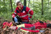 Mut fassenNach einem Wanderunfall kommt Nadine Bütow (Tina Schorcht, M. mit Komparse) mit einem offenen Bruch ins Klinikum. Moreau (Mike Adler, r.) und Rebecca (Milena Straube, l.) übernehmen die Patientin.Bild: © MDR/ARD/Jens Ulrich Koch