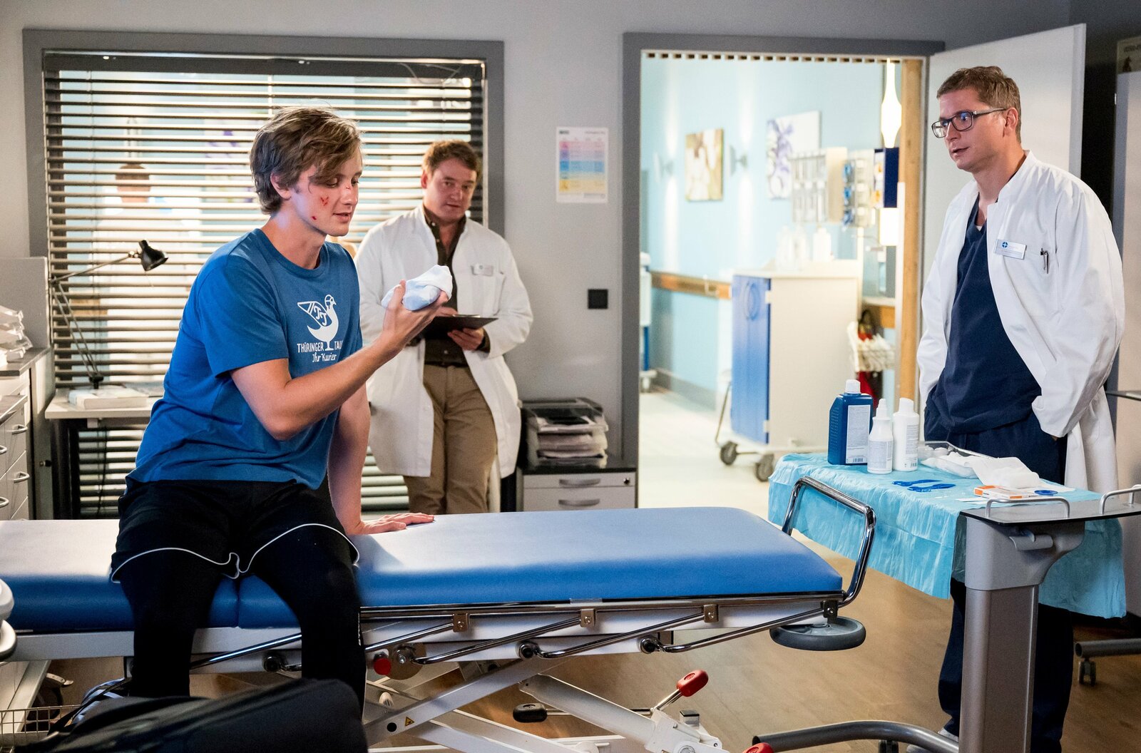 IrrwegeDer Medizinstudent Matthias Doppler (David Nolden, l.) aus Jena wird im Behandlungsraum von Marc Lindner (Christian Beermann, h.M.), Elias Bähr (Stefan Ruppe, r.) untersucht und versorgt.Bild: © MDR/ARD/Jens Ulrich Koch