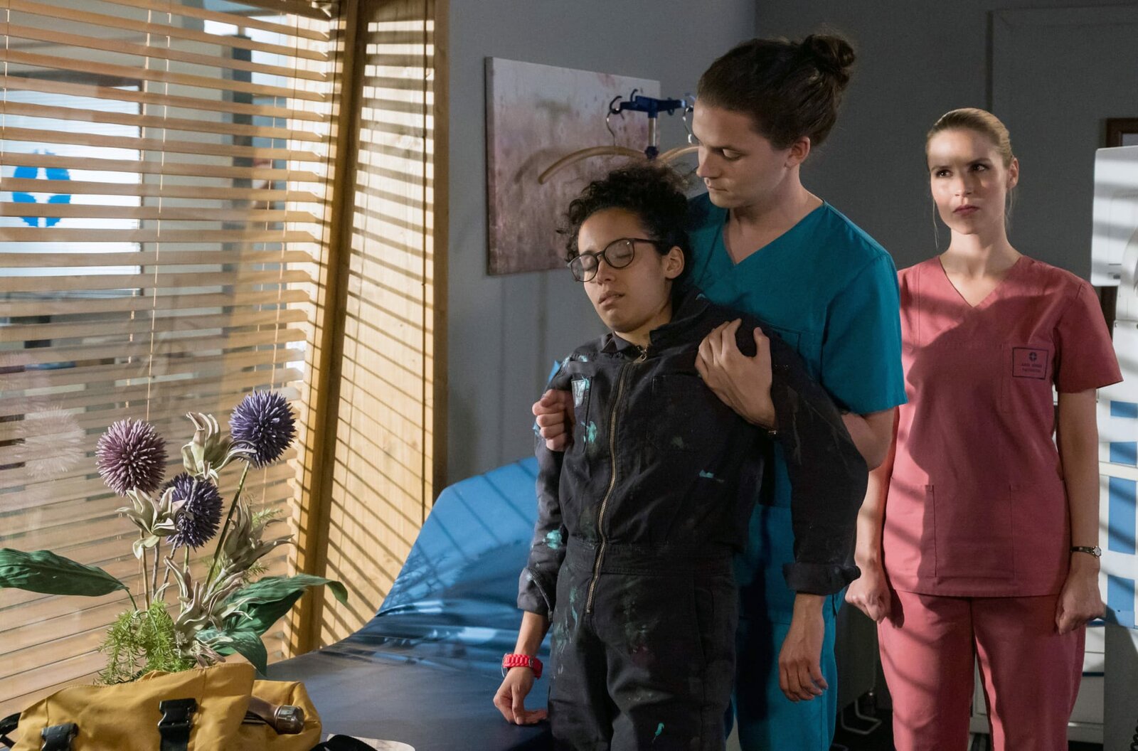 MitläuferARD IN ALLER FREUNDSCHAFT - DIE JUNGEN ÄRZTE FOLGE 243, "Mitläufer", am Donnerstag (14.01.21) um 18:50 Uhr im ERSTEN. Das Verhalten von Emmas (Elisa Agbaglah, l.) Patienten Nick Kranz (Niklas Post, M. mit Komparse, r.), gibt große Rätsel auf. Alamiert ruft Emma Matteo an. © ARD/Jens Ulrich Koch, honorarfrei - Verwendung gemäß der AGB im engen inhaltlichen, redaktionellen Zusammenhang mit genannter ARD-Sendung bei Nennung "Bild: ARD/Jens Ulrich Koch" (S2+). ARD-Programmdirektion/Bildredaktion, Tel: 089/5900-23534, bildredaktion@DasErste.deBild: © ARD/Jens Ulrich Koch / ARD-Programmdirektion