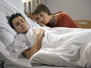 Auge in AugeMichael Geissler (Max Urlacher, re.) hat sich bei einer Schlägerei mit seinem ehemalige Freund Oliver an der Hand verletzt. Beim Verbandswechsel muss Hans-Peter Brenner (Michael Trischan, li.) feststellen, dass sich die Wunde stark entzündet hat. Außerdem hat Michael hohes Fieber.Bild: © MDR/Saxonia/Wernicke
