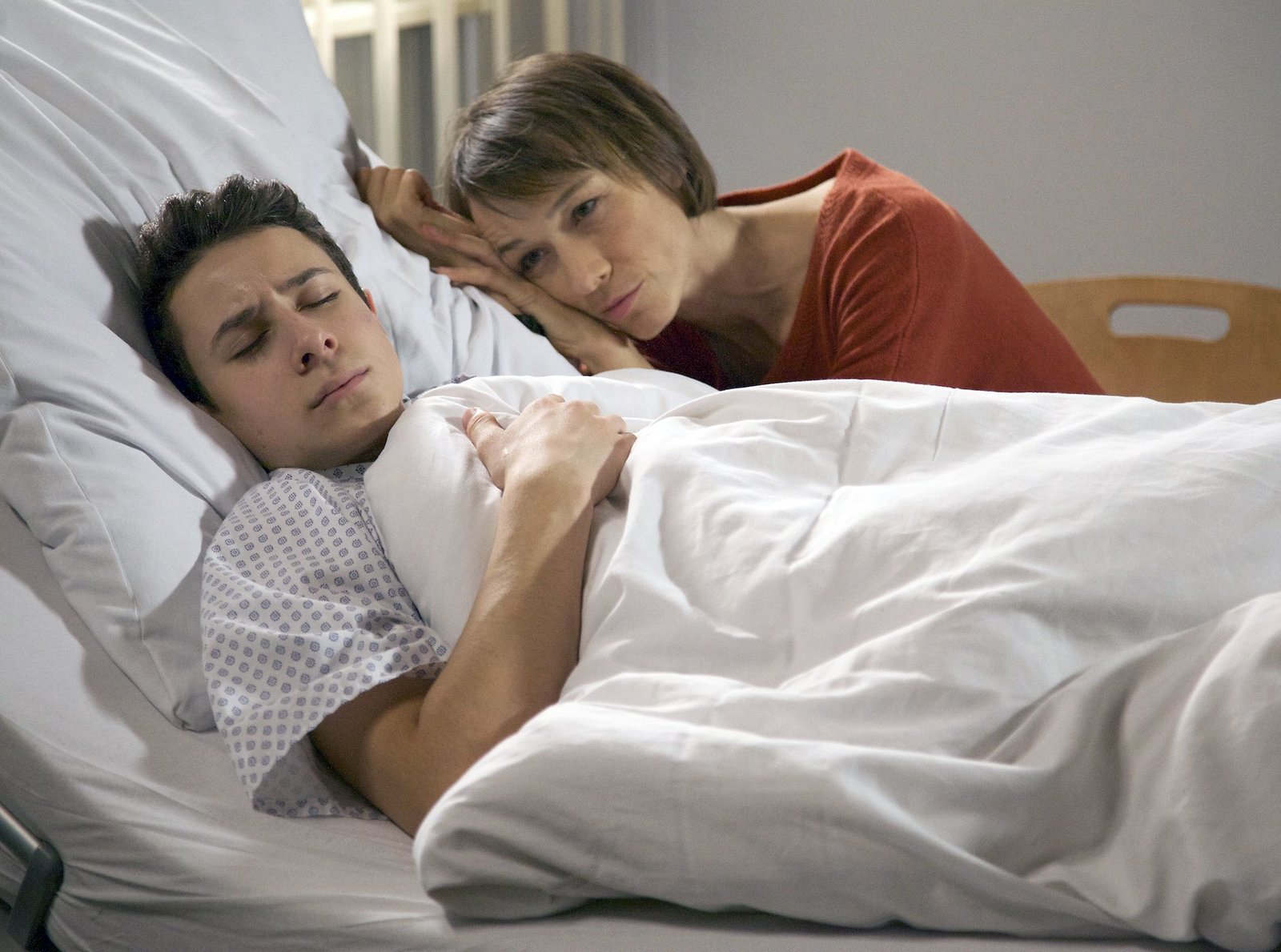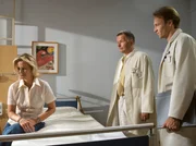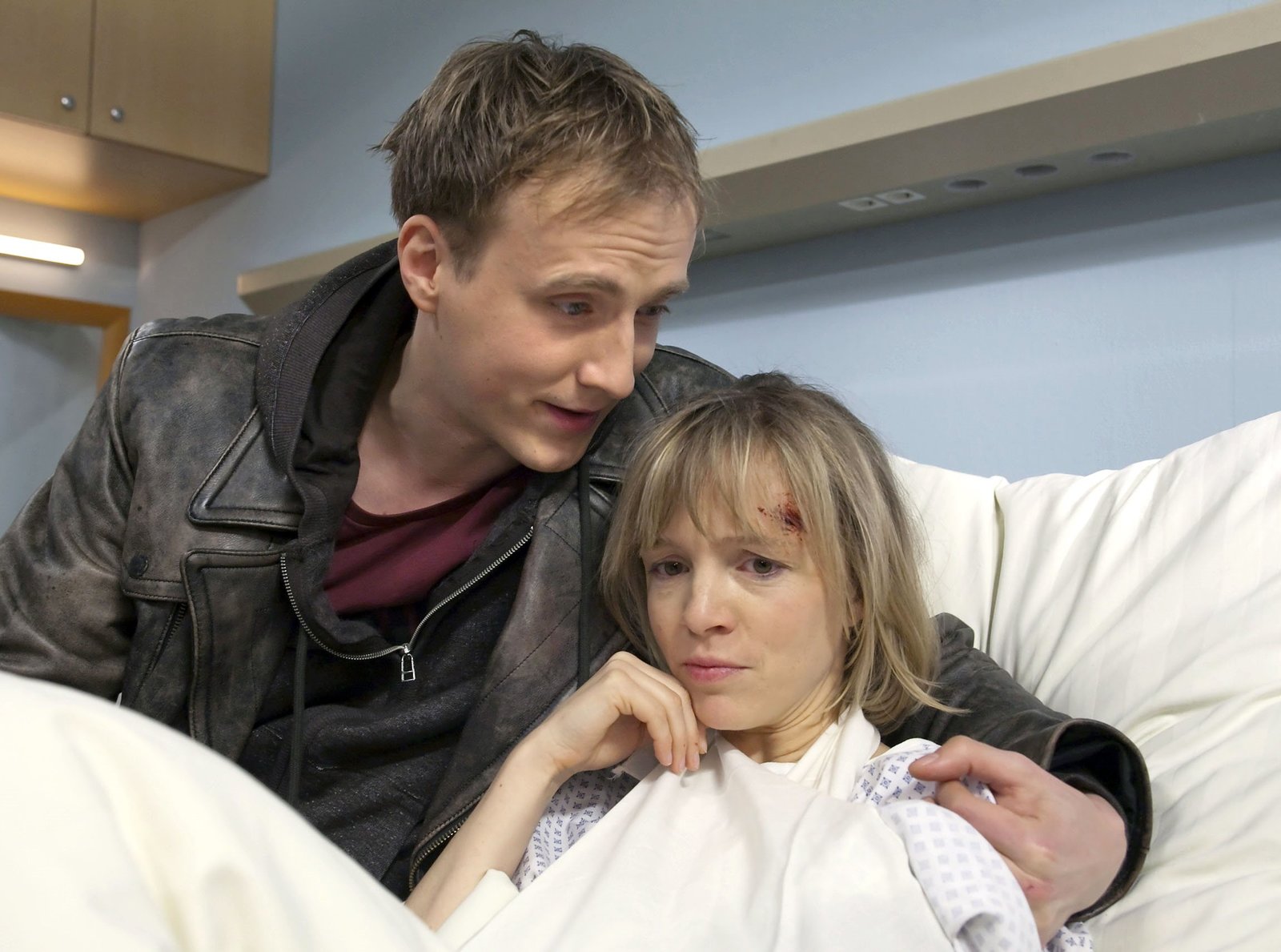 Auf fremdem BodenDie 16jährige Jule Winkler (Hanna Schwamborn, liegend) wird mit einer Beckenfraktur in die Sachsenklinik eingeliefert. Als Dr. Martin Stein (Bernhard Bettermann, rechts) die eher obligatorische Frage nach einer Schwangerschaft stellt und Jule mit "Ja" antwortet, fällt ihr Vater Jürgen Winkler (Stephan Szász) aus allen Wolken. Jule will das Kind behalten und sich nicht operieren lassen.Bild: © MDR/MDR/Krajewsky