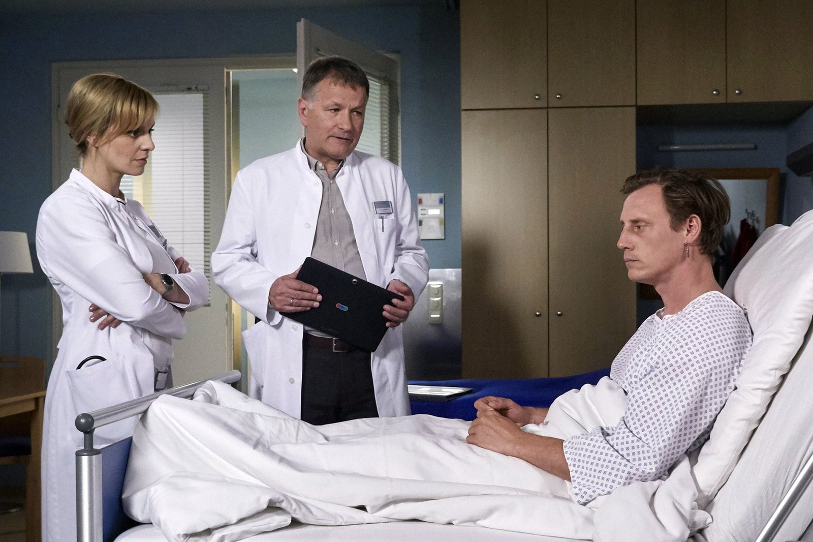 Geballte LadungDr. Lea Peters (Anja Nejarri, li.) hat tatsächlich ein Hirn-Aneurysma bei Jenne Derbeck (Patrick Kalupa, re.) entdeckt. Dies muss dringend operiert werden, da es jederzeit platzen könnte. Da Jenne Lea für seine Traumfrau hält, hat sie Dr. Roland Heilmann (Thomas Rühmann, mi.) um Hilfe gebeten. So hört Jenne wenigstens zu. Als Jenne jedoch erfährt, dass er sich nach der OP unter Umständen nicht mehr an bestimmte Dinge erinnern kann, entscheidet er sich gegen die OP. Das Risiko, sich danach nicht mehr an Lea erinnern zu können ist ihm zu groß. Jeden logischen Einwand der Ärzte schmettert Jenne ab.Bild: © MDR/Saxonia/Kiss