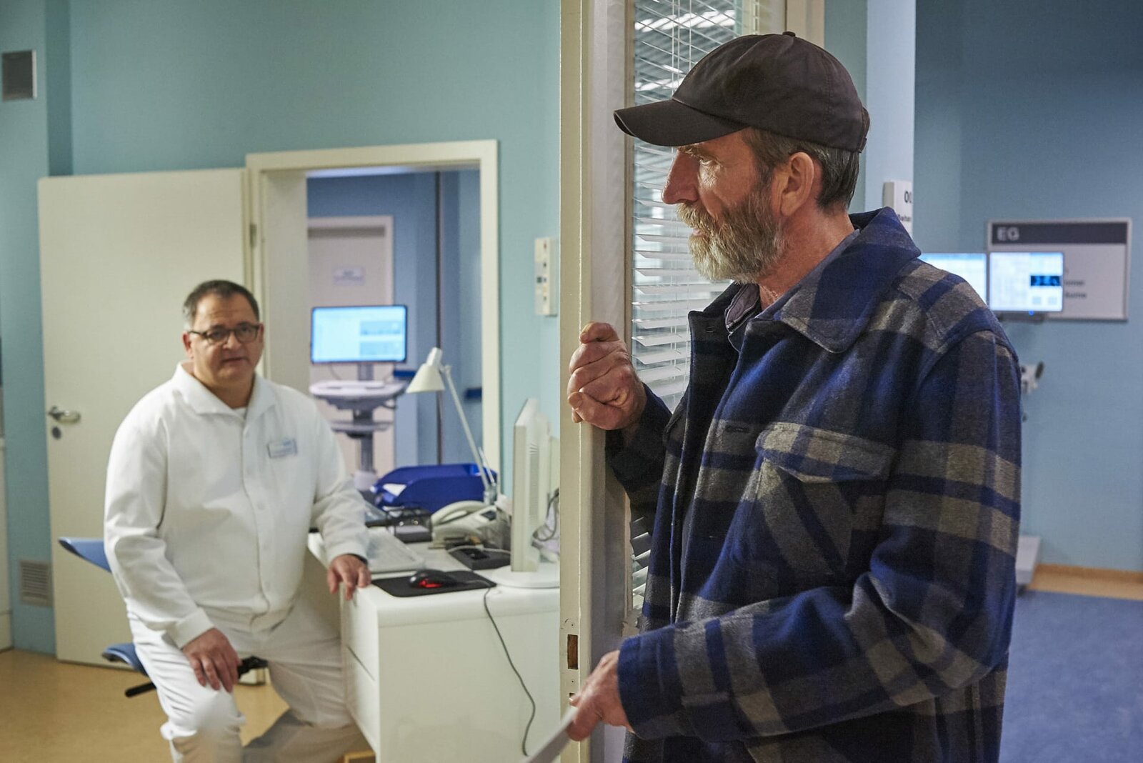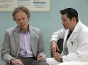 Schweres ErbeBei der Untersuchung von Wolfram Brentano (Thomas Bading, links) stellt sich heraus, dass es sich um einen Tumor am Hörnerv handelt. Er muss also am Kopf operiert werden, aber damit können die Ärzte einer Verschlimmerung vorbeugen. Dr. Philipp Brentano (Thomas Koch) versucht seinen Onkel zu beruhigen.Bild: © MDR/MDR/Krajewsky