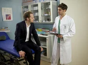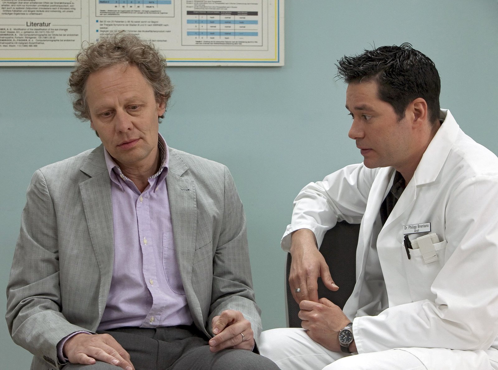 Alles auf eine KarteMarkus Wiedemann (Christian Näthe, links) ist nach einer durchzechten Nacht im Casino entkräftet zusammengebrochen. Er ist zwar schnell wieder auf den Beinen, aber die Untersuchungen durch Dr. Niklas Ahrend (Roy Peter Link) bringen einen Zufallsbefund ans Licht. Markus hat ein Aneurysma im Kopf, das schnellstens operiert werden muss. Markus hat am nächsten Tag ein lukratives Pokerturnier und würde die OP gern verschieben. Niklas macht Markus den Ernst der Lage klar und dass das Aneurysma jederzeit platzen könnte. Markus bittet Niklas, seiner Schwester Inka nichts davon zu erzählen.Bild: © BR/MDR/Rudolf K. Wernicke