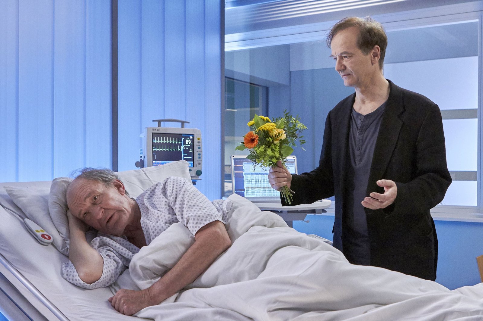 BestimmungSchauspieler Joseph Bernau (Michael Mendl, li.) ist kurz vor einer Theatervorstellung mit einem Niereninfarkt zusammengebrochen. Sein alter Freund und Kollege Götz Neumeier (Arnfried Lerche, re.), der ewig Zweite, wittert seine Chance, endlich auch mal in der ersten Reihe zu stehen und das gesamte Rollen-Repertoire von Joseph zu übernehmen. Joseph ahnt, dass Götz' Krankenbesuch nicht nur freundschaftliche Besorgnis ist.Bild: © MDR/Saxonia Media/Kiss