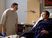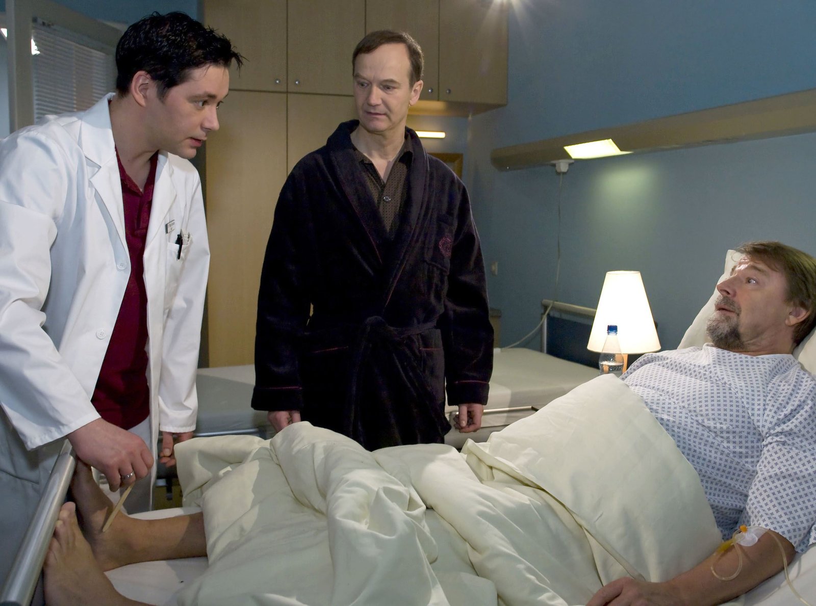 Der Hang zum ÜberschwangHans Lambert (Jürgen von der Lippe, rechts) kann nach der Notoperation seine Beine nicht mehr fühlen. Dr. Brentano (Thomas Koch) versucht, ihn zu beruhigen, dass dieses Taubheitsgefühl zurückgeht. Ferdinand Pommrenke (Arnfried Lerche, links) macht sich Sorgen um seinen Nachbarn.Bild: © MDR/MDR/Saxonia/Peter Krajewsky
