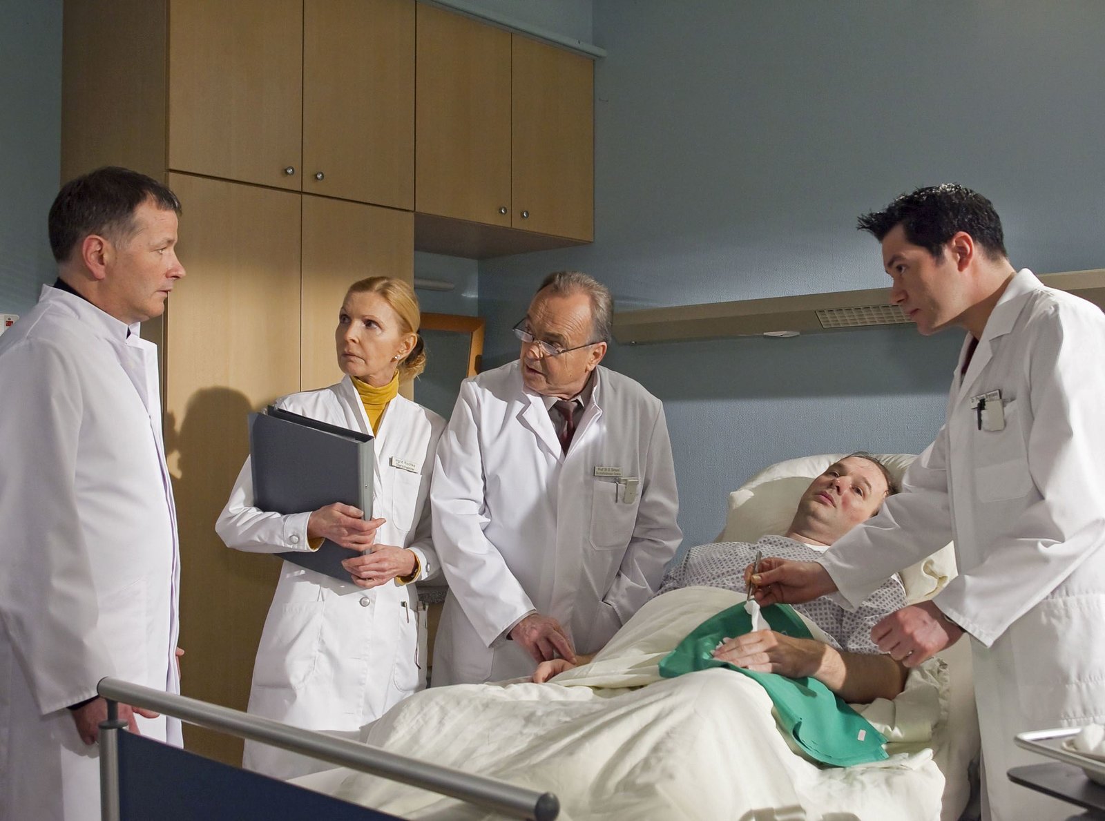 Anders als gedachtBei Fred Vogel (Stephan Grossmann, liegend) hat sich tatsächlich eine Wundinfektion gebildet. Als Prof. Simoni (Dieter Bellmann, 3.von links) Dr. Heilmann (Thomas Rühmann, links) bittet, ihm bei der Notoperation zu helfen, sieht der sich außer Stande. Dr. Brantano (Thomas Koch) ahnt den Grund für Rolands Verhalten und fragt Oberschwester Ingrid (Jutta Kammann, 2. von links), ob die Ergenbisse von Rolands Kontrolluntersuchung schon da sind. Als diese bejaht, ist Brentano fassungslos.Bild: © MDR/MDR/Saxonia/Peter Krajewsky