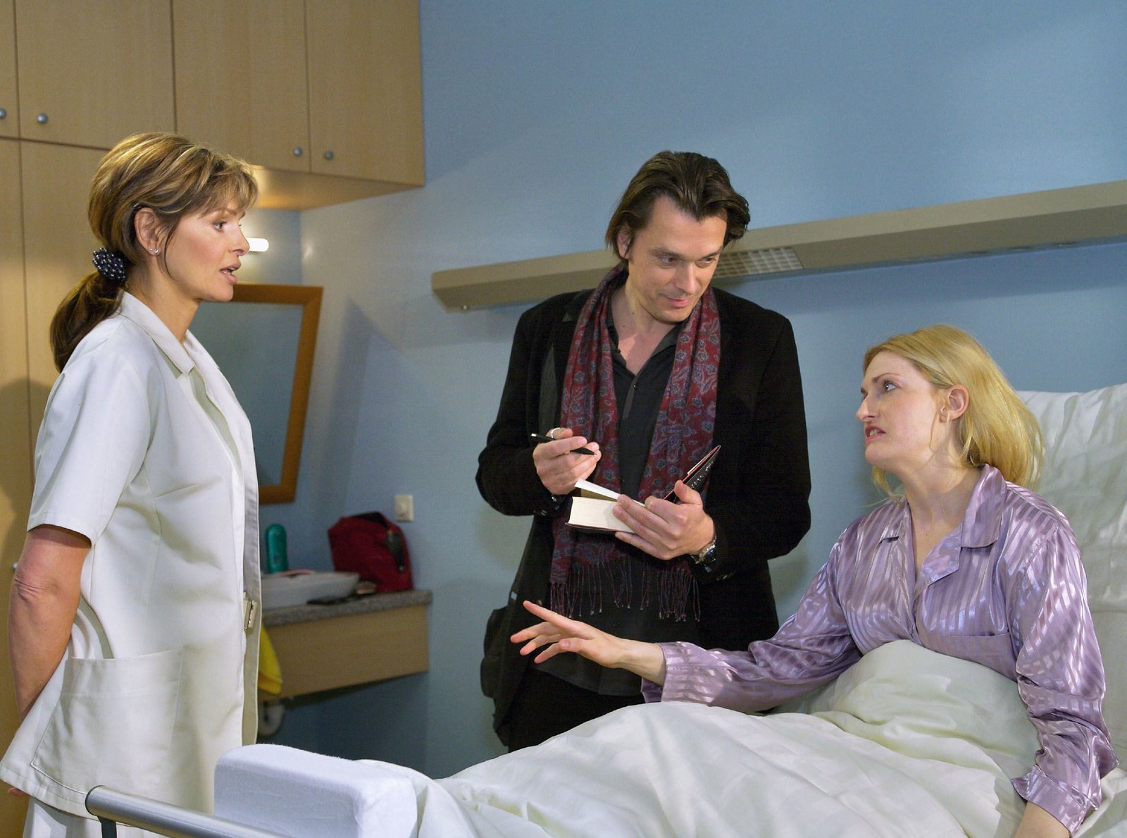 Liebe und GegenliebeAls Schwester Yvonne (Maren Gilzer, li.) Raphael Breitkopf (Hary Prinz, mi.) darum bittet, ihr Buch zu signieren, regiert Anke (Sandra Steinbach, re.) unbegründet übertrieben eifersüchtig und wirft Schwester Yvonne aus ihrem Krankenzimmer.Bild: © MDR/Krajewsky