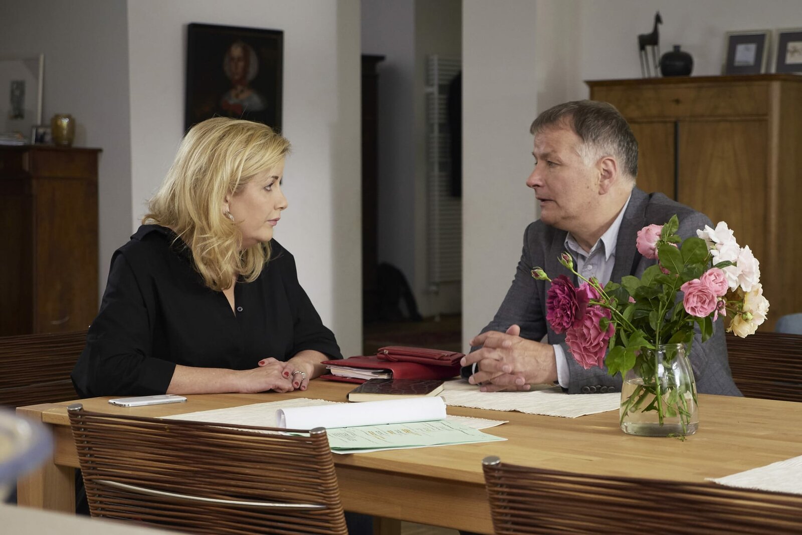 GravitationRoland Heilmann (Thomas Rühmann) ist bei Sarah Marquardt (Alexa Maria Surholt), um seinen Enkel Jonas abzuholen, der sich bei Marquardts verkriecht. Sarah nutzt die Gelegenheit, um Roland die Gefühlslage seines Enkels zu erklären: Jonas fühlt sich allein gelassen in seiner Trauer. Roland gibt offen zu, dass er im Moment nicht in der Lage ist, anders mit dem Tod seiner geliebten Frau Pia umzugehen.Bild: © MDR / Rudolf Wernicke Lizenzbild frei