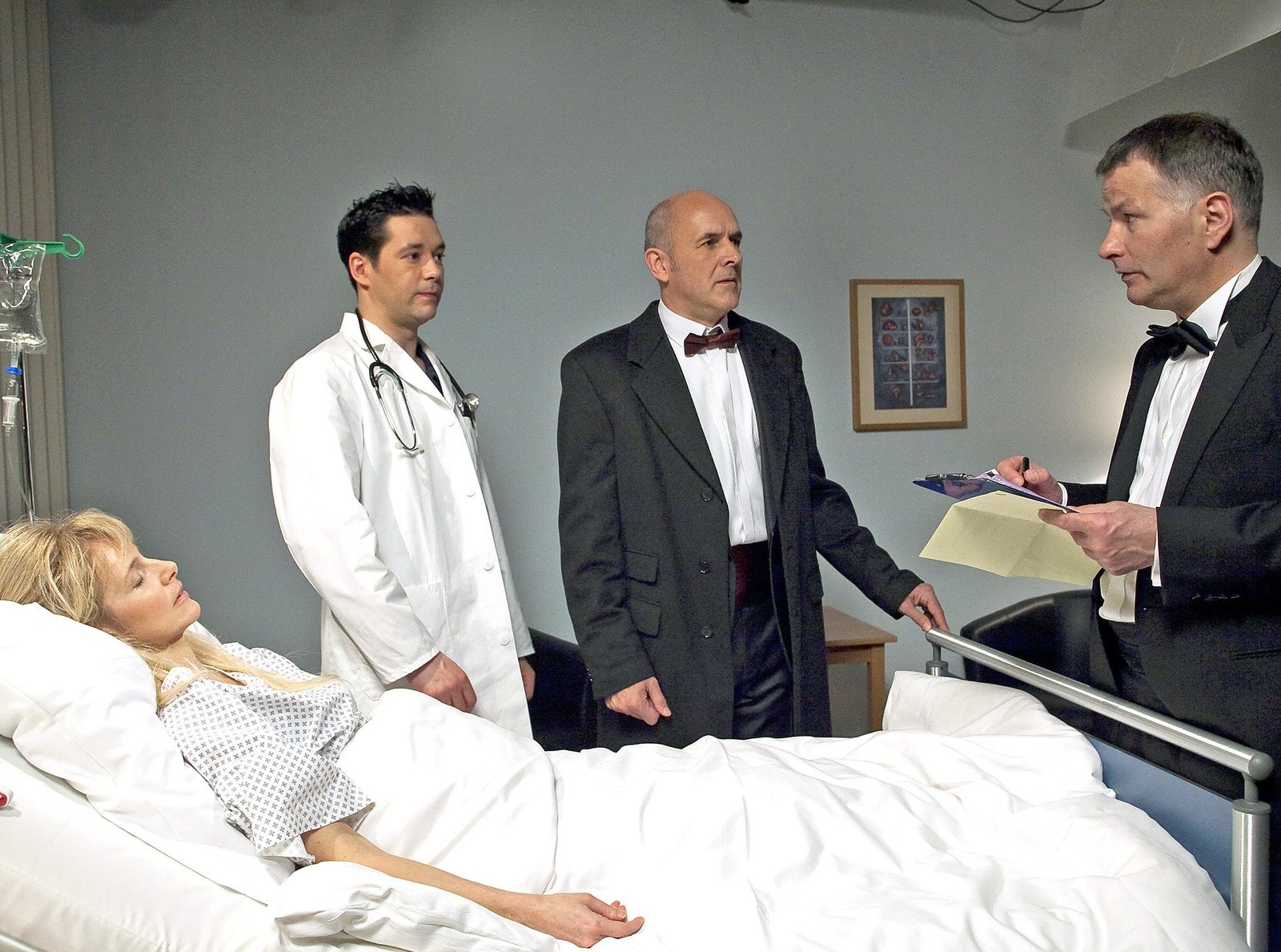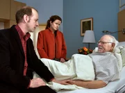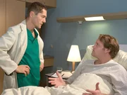 Bittersüße AugenblickeARD/MDR IN ALLER FREUNDSCHAFT FOLGE 484, "Bittersüße Augenblicke", am Dienstag (17.08.10) um 21:05 Uhr im ERSTEN. Gunter Mensing (Klaus Schindler, mi.) will sich bei Roland Heilmann (Thomas Rühmann, re.) bedanken. Doch der verweist ihn an Evelyn Mensings (Cay Helmich, liegend) behandelnden Arzt Dr. Philipp Brentano (Thomas Koch, li.). © MDR/Peter Krajewsky, honorarfrei - Verwendung gemäß der AGB im engen inhaltlichen, redaktionellen Zusammenhang mit genannter MDR-Sendung bei Nennung "Bild: MDR/Peter Krajewsky" (S2). MDR/HA Kommunikation, 04360 Leipzig, Tel: (0341) 300 6477 oder - 6463.Bild: © WDR