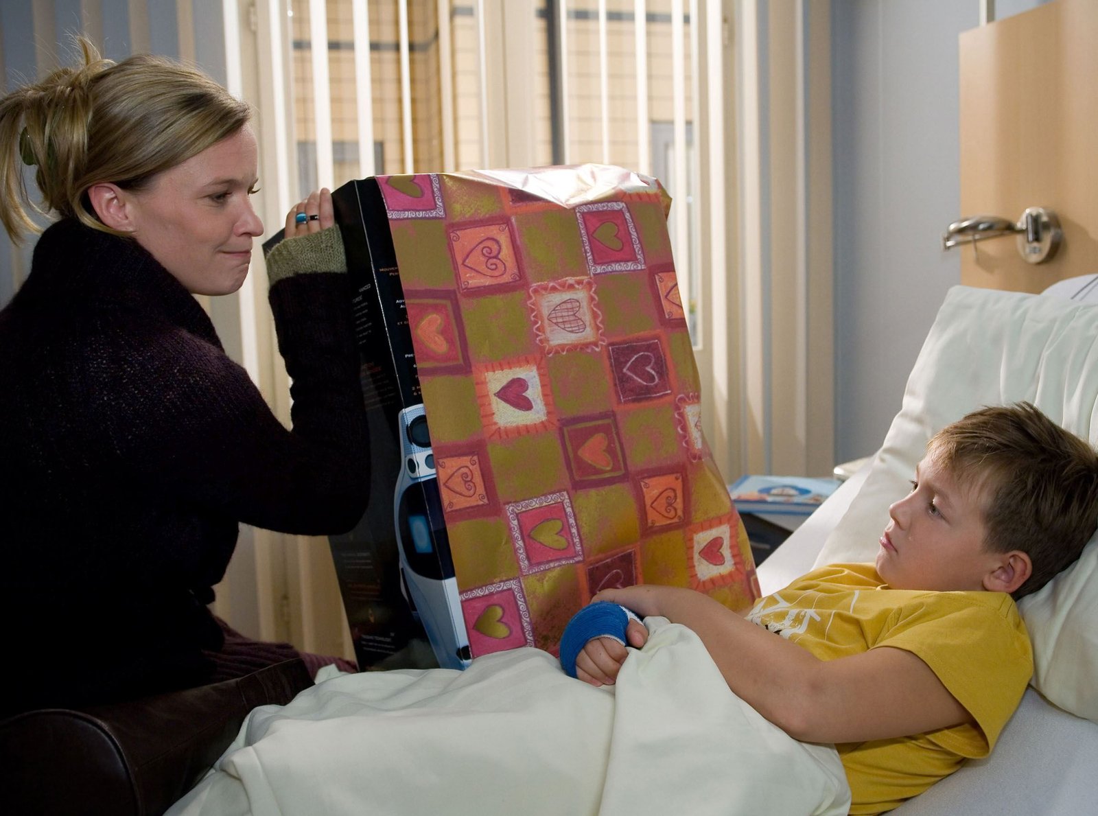 Wo das Gute beginntTrotz eines Streits mit Norbert Schlegel besucht Carola Grund (Anna von Berg) Tim (Leo Natalis) im Krankenhaus. Tim leidet sichtlich unter dem Streit zwischen seinem Vater und Carola.Bild: © MDR/MDR/Krajewsky