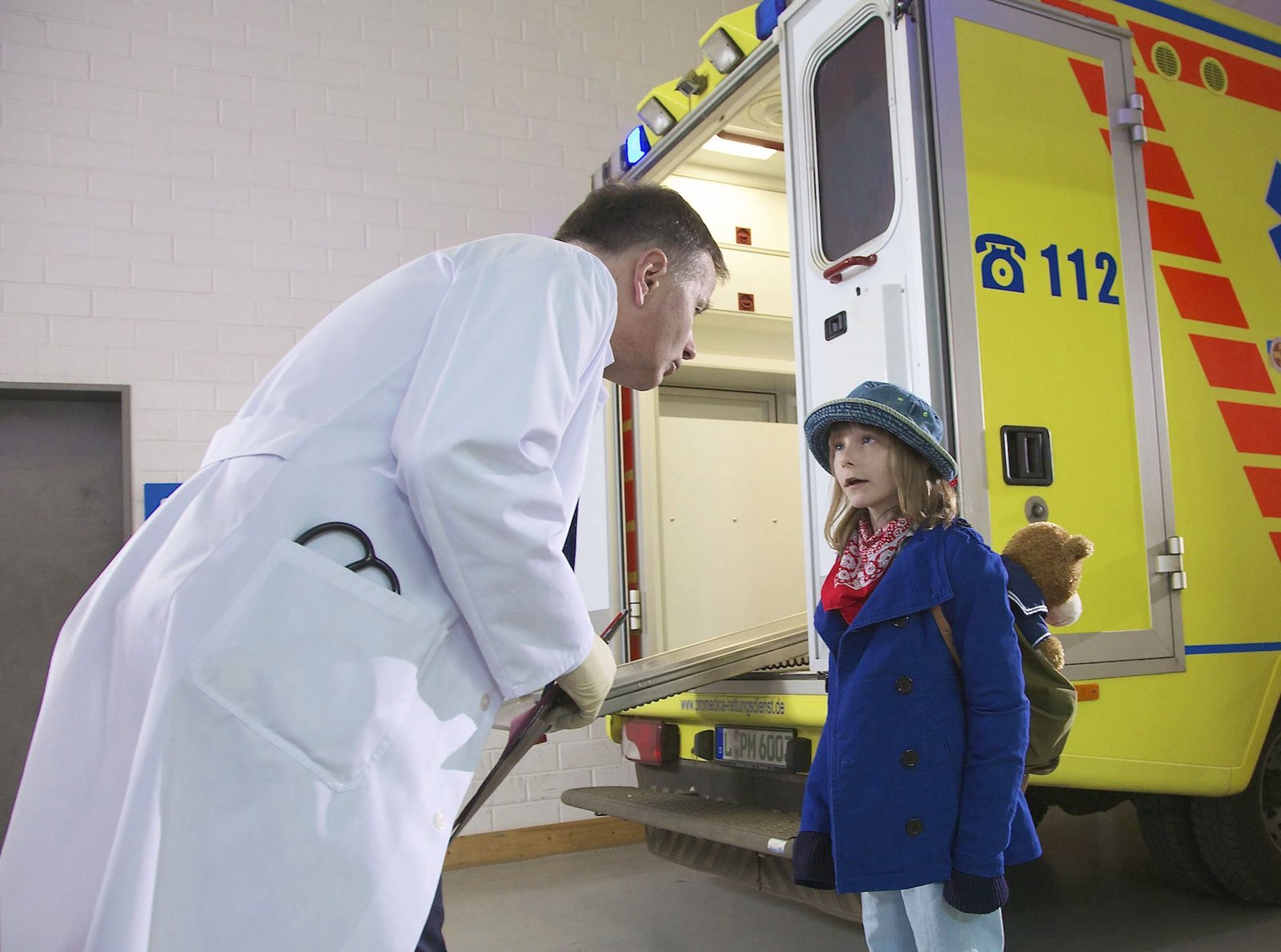 MachtlosARD/MDR IN ALLER FREUNDSCHAFT, FOLGE 528, "Machtlos", am Dienstag (02.08.11) um 21:05 Uhr im ERSTEN. Als ihr Opa ins Krankenhaus eingeliefert wird, bleibt die kleine Tabea Uhlemann (Paraschiva Dragus) allein am Rettungswagen zurück. Roland Heilmann (Thomas Rühmann) entdeckt sie und fragt nach ihren Eltern. Diese sind für drei Wochen in den Urlaub gefahren, erklärt Tabea und in dieser Zeit passe ihr Opa auf sie auf.Bild: © MDR/Rudolf Wernicke