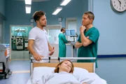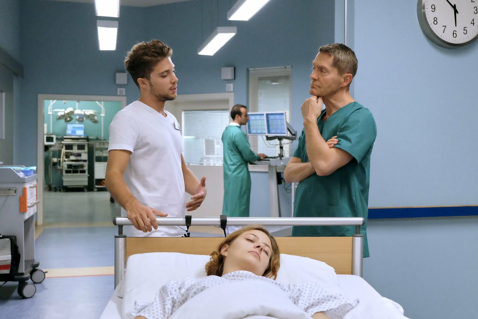 ZukunftsmusikARD/MDR IN ALLER FREUNDSCHAFT FOLGE 672, "Zukunftsmusik", am Dienstag (20.01.15) um 21:00 Uhr im ERSTEN. Paul Greiner (Mirco Reseg, liegend) ist nach einem Streit mit seiner Freundin kollabiert. Die Untersuchung durch Dr. Philipp Brentano (Thomas Koch, re.) und Oberschwester Arzu (Arzu Bazman, li.) zeigt, dass sein Zustand lebensbedrohlich ist. Paul muss sofort operiert werden.Bild: © MDR/Wernicke