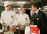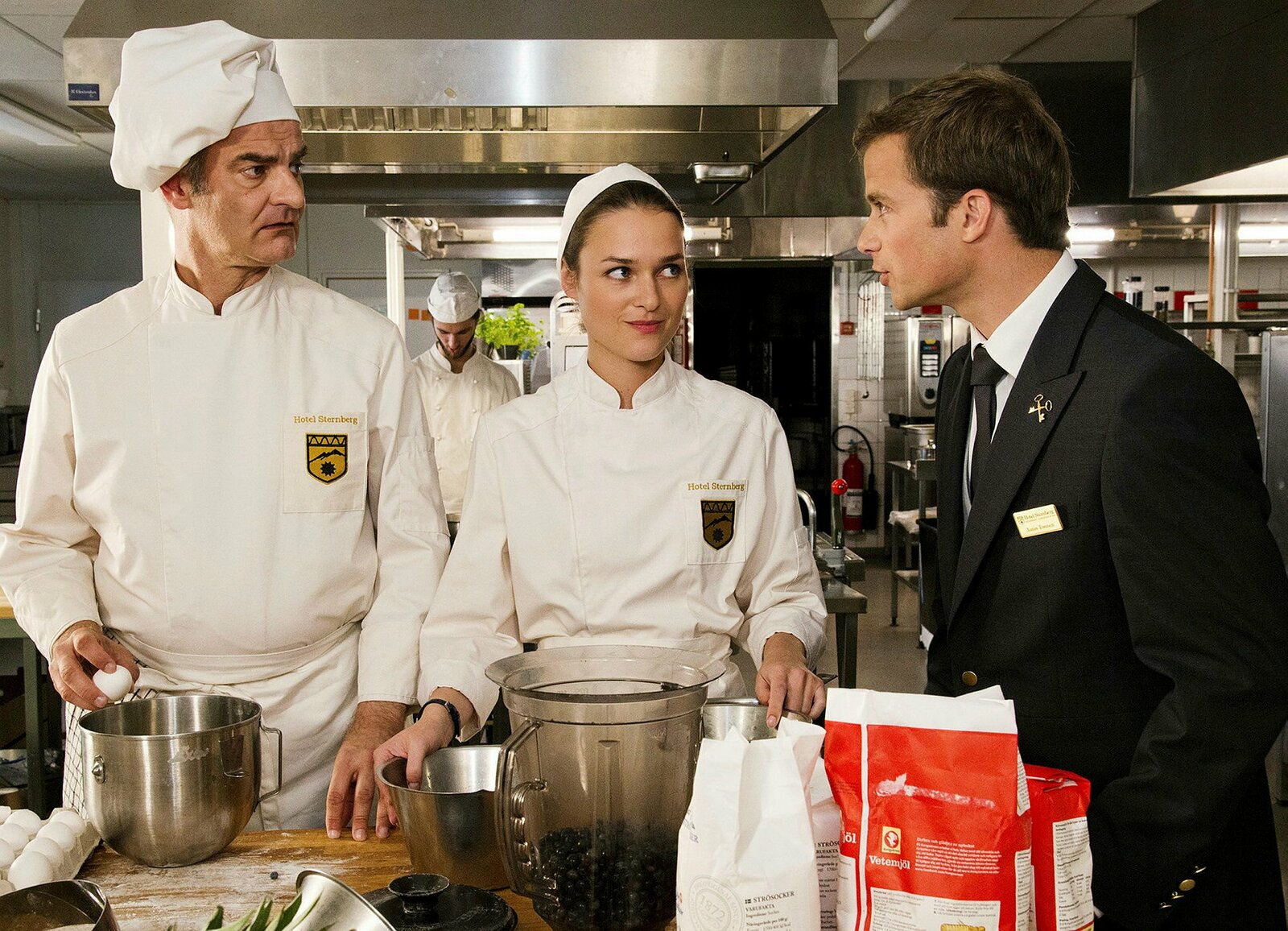 Süße Leidenschaft - Liebesgeschichte aus SchwedenZusammentreffen in der Küche:Heinrich Schafmeister als Mika Stendal, Josephin Busch als Hilla, Roman Roth als Jonas (Copyright SRF/ZDF/Marco Meenen)Bild: © DRS