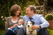 Britisches Roulette"Inspector Barnaby - Britisches Roulette": Die Barnabys sitzen im Garten: Sarah (Fiona Dolman) hält Betty im Arm. Sie und John (Neil Dudgeon) schauen sich an. John streichelt Hund Sykes, der vor ihm sitzt.Bild: © ZDF