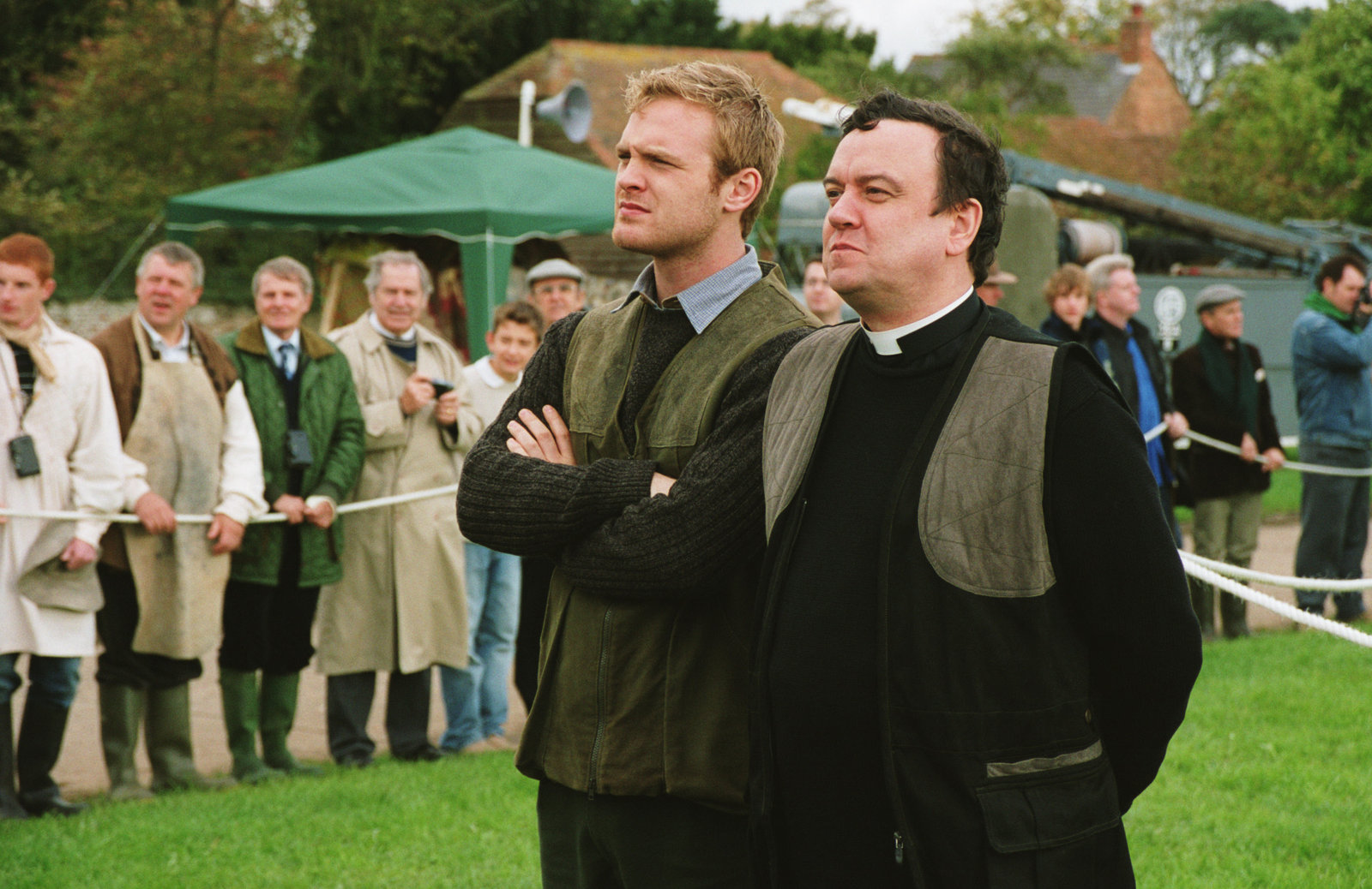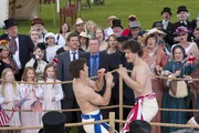 Erst morden, dann heiratenReverend Anthony Gant (Richard McCabe, r.) muss sich zu Pferd gegen eine Schar Frauen behaupten - so will es die Tradition dieses Dorffestes. Roland Marwood Joseph Kennedy) wird ihm die Daumen drücken.Bild: © ZDF und Mark Bourdillon