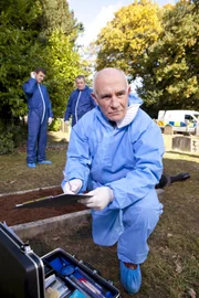Da hilft nur betenInspector Barnaby (Neil Dudgeon, h.) und Dr. Kate Wilding (Tamzin Malleson, v.) haben viele Fragen angesichts dieser Leiche.Bild: © ZDF und Mark Bourdillon.