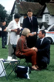 Tod in Badger's DriftInspector Barnaby (John Nettles, l.) befragt den Hausarzt von Emily Simpson, Dr. Lessiter (Bill Wallis, M.), dessen zweite Frau Barbara (Diana Hardcastle, 2.v.l. sitzend) und seine Tochter Judy (Jessica Stevenson, r.) nach ihren Alibis.Bild: © ZDF und Bentley Production