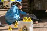 Das untote DorfDr Kam Karimore (Manjinder Virk) betastet eine Leiche unter den Ketten eines Panzers.Bild: © ZDF und Mark Bourdillon 07831605033