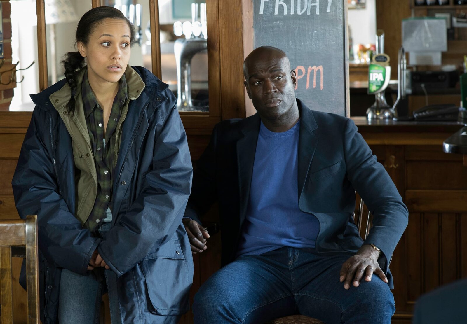 Alles Böse kommt von obenOrla Campbell (Tanya Fear, l.) und ihr Vater Victor Campbell (Steve Toussaint, r.) wissen beide, dass sie einander nicht die Wahrheit sagen.Bild: © ZDF und Neil Genower.