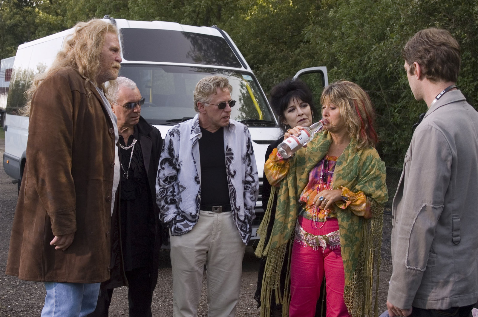 Mord mit GrooveManager Simon Dixon (Jack Hazeldine, r.) hat die legendäre Band "Hired Gun" wieder vereint: Gitarrist Jack McKinley (James Cosmo, l.), Drummer Nicky Harding (Michael Angelis, 2.v.l.), Bass-Gitarrist Gary Cooper (Phil Davis, 3.v.l.), Nickys Frau Jeannie (Rachel Davies, 3.v.r.) und Sängerin Mimi Clifton Quatro (Suzi Quatro).Bild: © ZDF