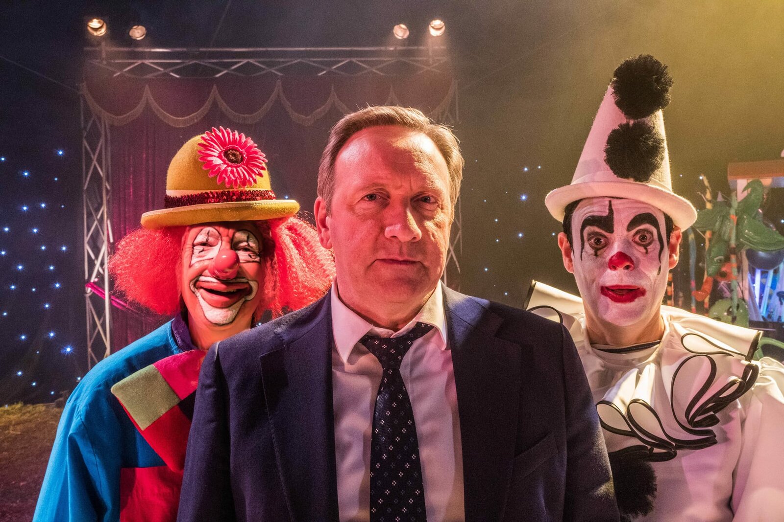 Ein Mords-ZirkusSchwierige Ermittlungen für Inspector John Barnaby (Neil Dudgeon, M.) in einem Zirkus: Es gibt einen tödlichen Zwischenfall beim Auftritt der Clowns Les "Oucho" Morrison (Mike Grady, l.) und Terry "Groucho" Bellini (Kevin Eldon).Bild: © ZDF und Mark Bourdillon.