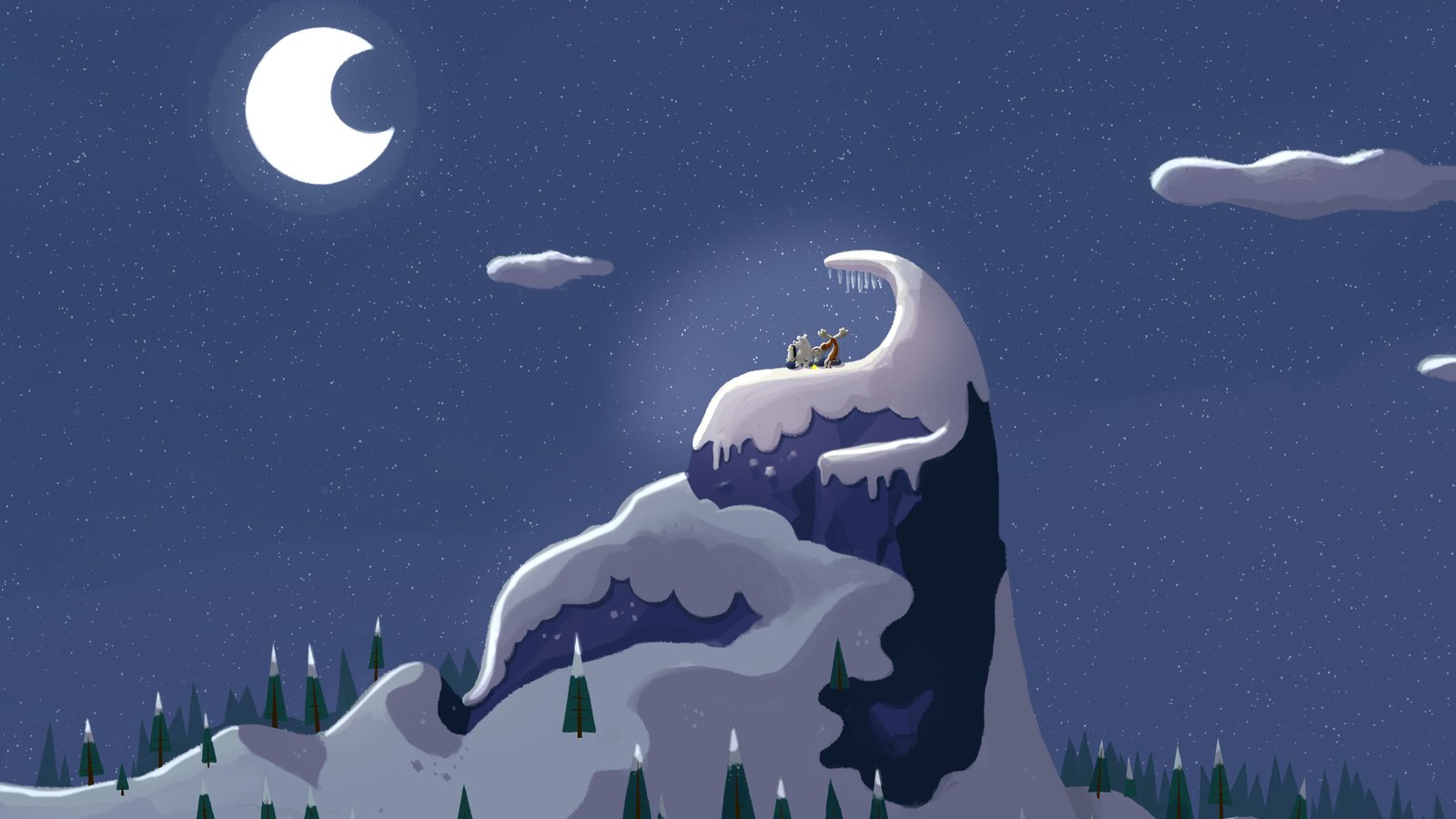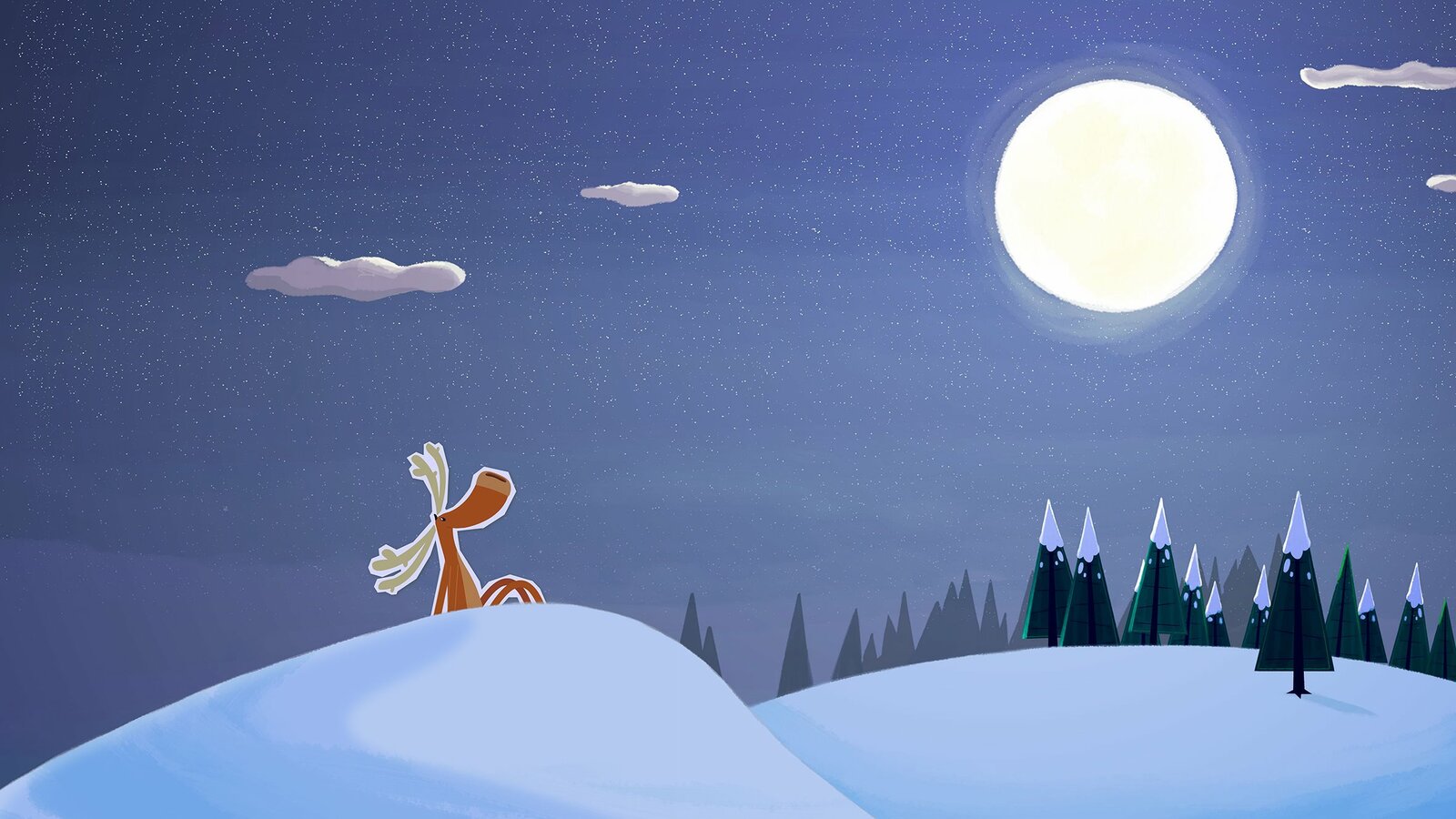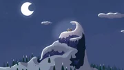 Kleine Eule allein im SchneeMitten in der Nacht sitzt Hubert im Schnee und bewundert den strahlenden Vollmond. Da hört er in der Ferne ein Geräusch.Bild: © ZDF/JEP Animation