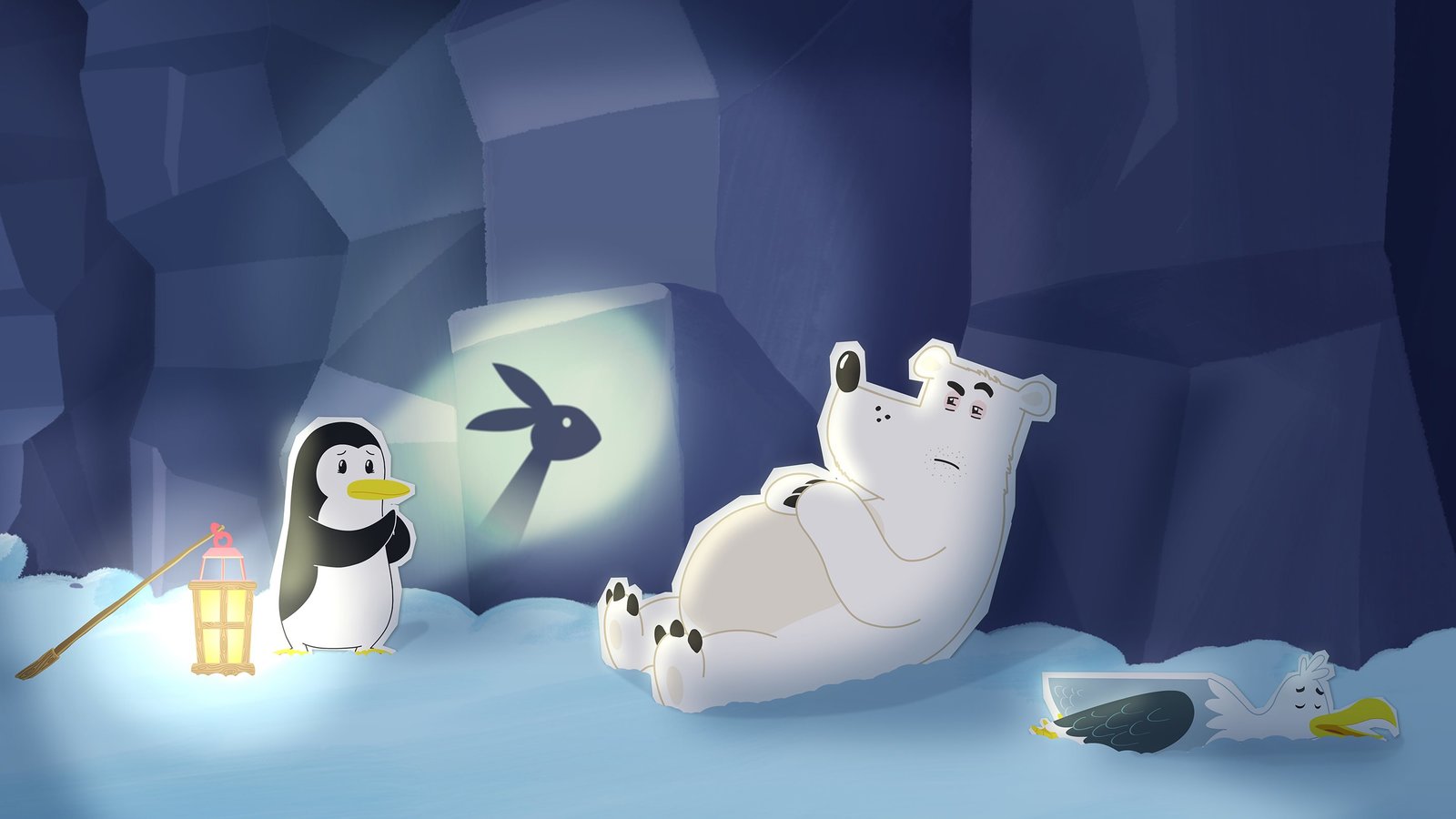 Grumpel kann nicht schlafenSelbst ein märchenhaftes Schattenspiel von Pinguin Lissy kann den Eisbären Grumpel nicht richtig ermüden. Er ist zwar total erschöpft, aber der letzte Kick zum endgültigen Einschlafen gelingt ihm doch nicht.Bild: © ZDF/JEP Animation