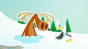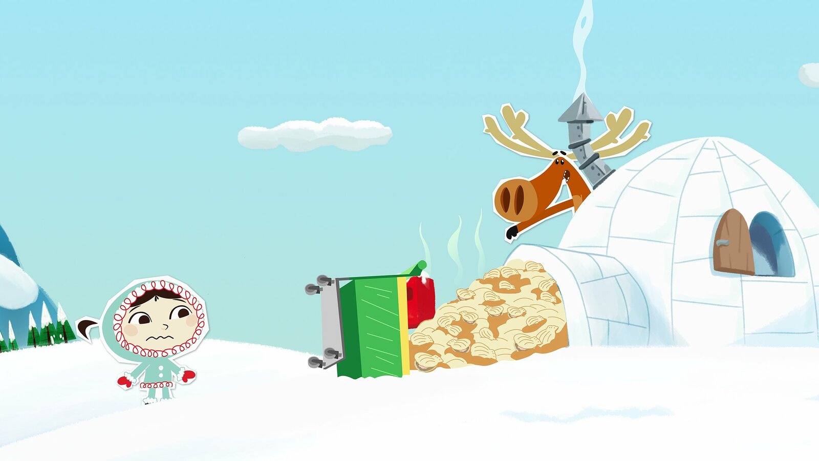 Eisangeln – aber richtig!Hubert will sich bei Inui entschuldigen. Die Frage ist allerdings, ob eine ins Iglu gekippte Ladung von kräftig stinkenden Muscheln die richtige Methode sein soll.Bild: © ZDF/JEP Animation