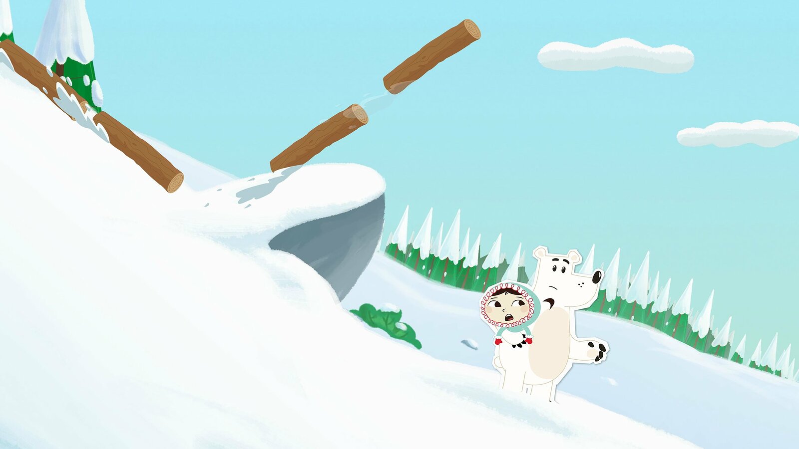 Verfolgt von einem SchneeballEin Felsen verhindert, dass Inui und Grumpel von den unkontrolliert den Berg runterrutschenden Holzstämmen getroffen werden.Bild: © ZDF/JEP Animation