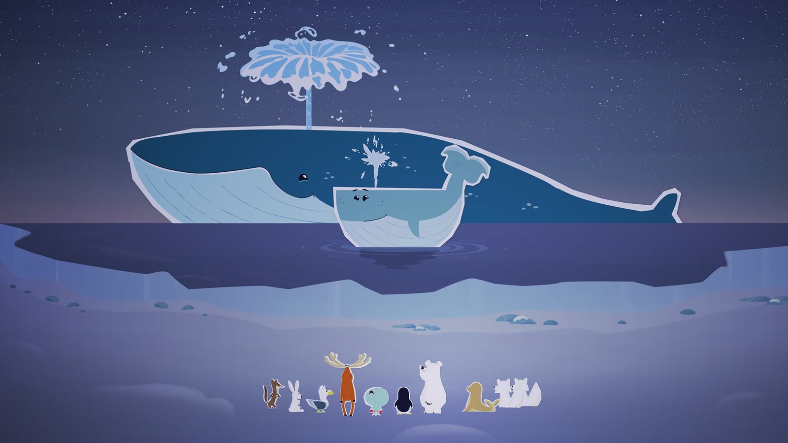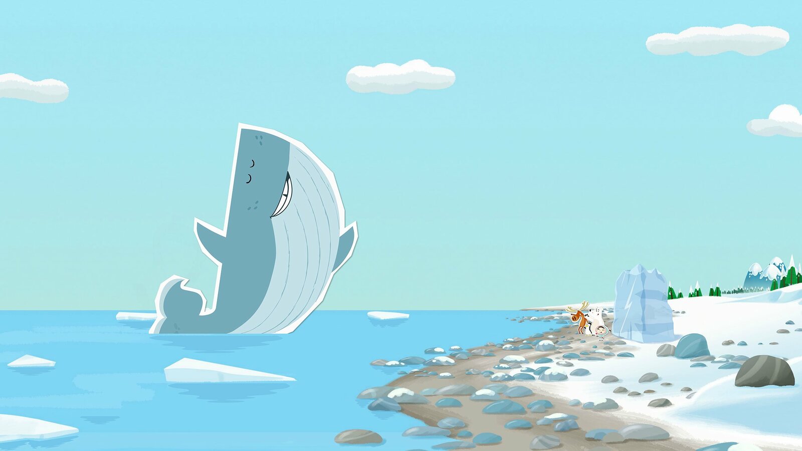 Das Traumpalast-IgluInui und alle anderen tierischen Bewohner des Nordpols sind völlig verblüfft: sie hätten sich nie vorstellen können, dass es noch einen viel gröüeren Wal gibt als ihre Wal-freundin Wiebke. ÂBild: © ZDF/JEP Animation