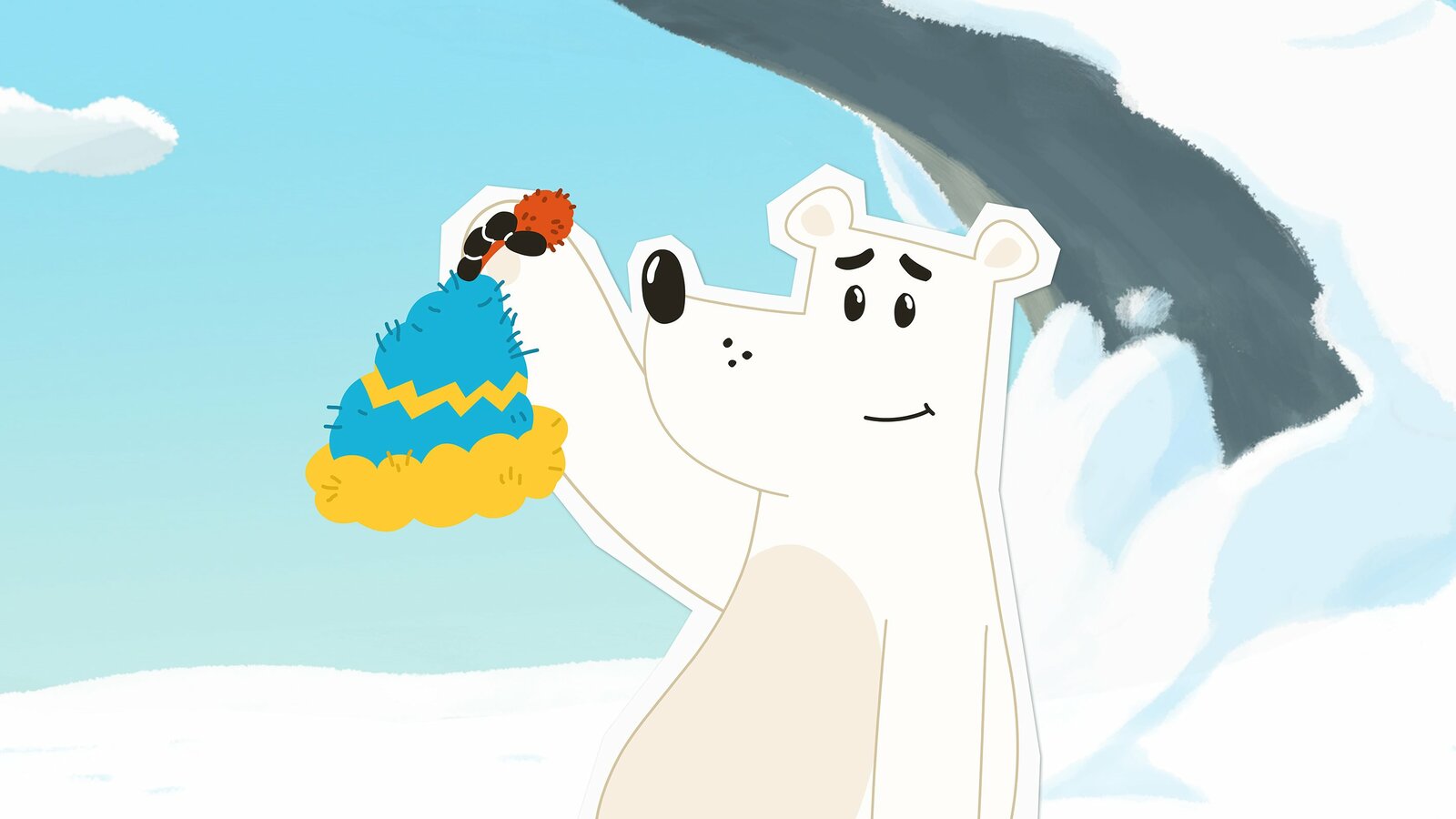 Starker Bär ganz schwachGrumpel ist begeistert: Irgendjemand hat ihm eine warme Mütze gestrickt und in die Nähe seiner Höhle gelegt. Aber wer war das wohl? Das will er nun unbedingt herausfinden – denn da scheint ihn jemand sehr zu mögen.sehr zu mögen.Bild: © ZDF/JEP Animation