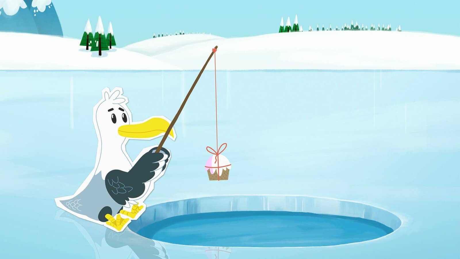Eisangeln – aber richtig!Die Pinguindame Lissy versucht, die Fische mit einem leckeren Kuchen zu ködern.Bild: © ZDF/JEP Animation