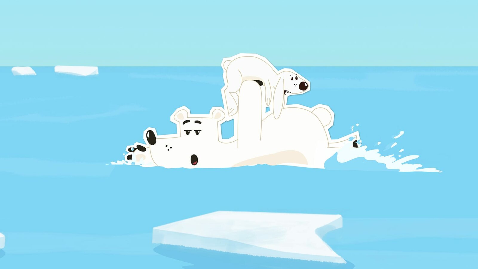 Ich wär' so gern ein cooler BärDer Schneehase Siggy wäre sehr gerne ein Eisbär wie Grumpel – aber dafür müsste er auf jeden Fall zuerst einmal schwimmen lernen.Bild: © ZDF/JEP Animation