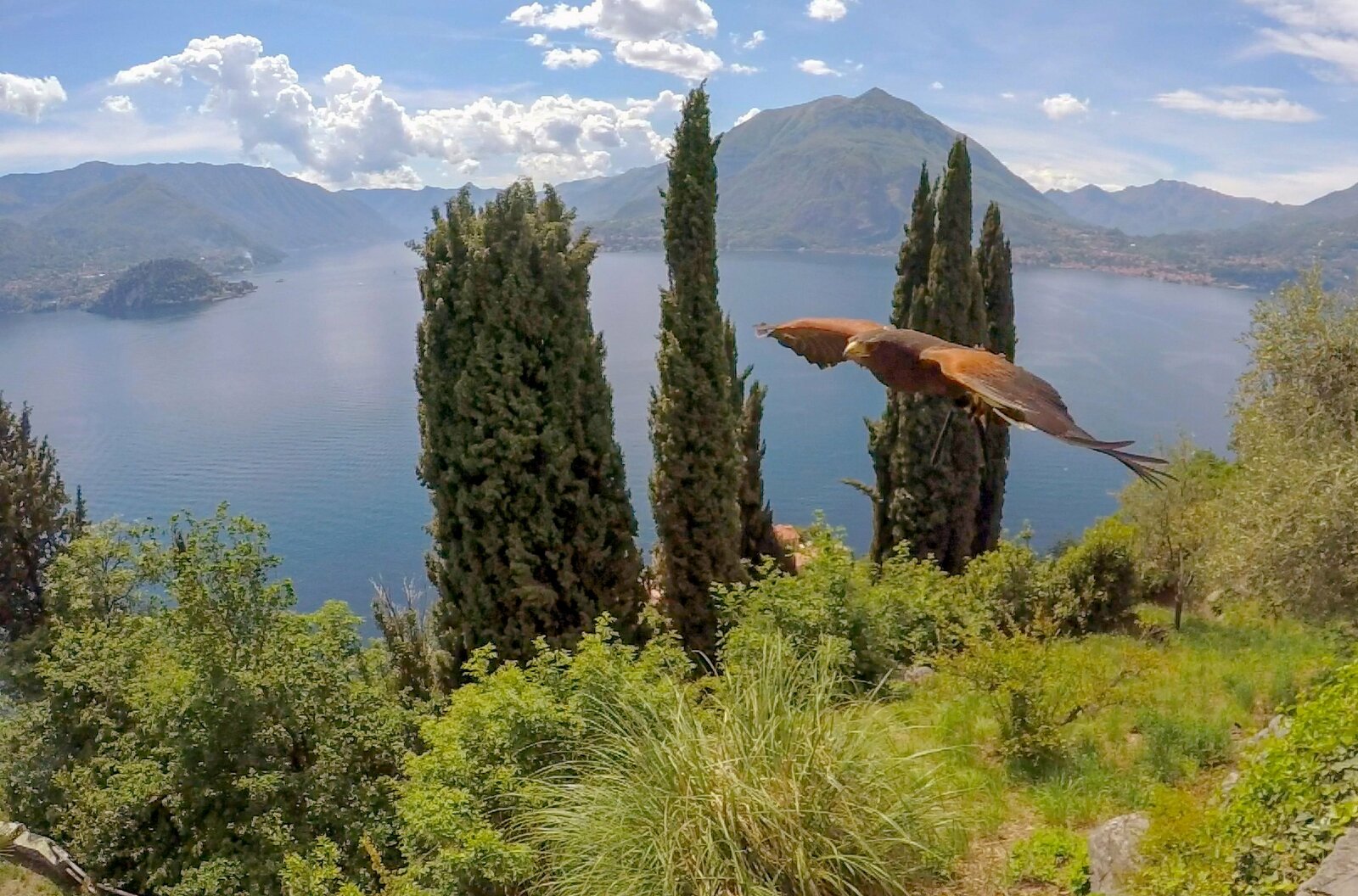 Am Comer SeeEin Wüstenbussard fliegt über den Comer See. Er lebt in der Falknerei auf dem Castello di Vezio.Bild: © Elise Loirthiose / © Elise Loirthiose