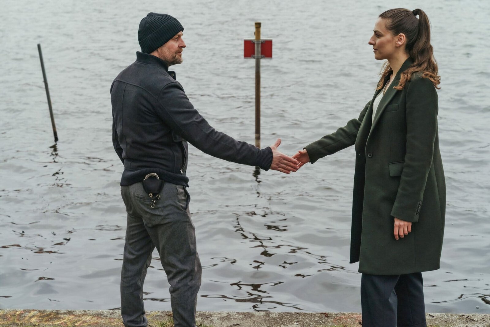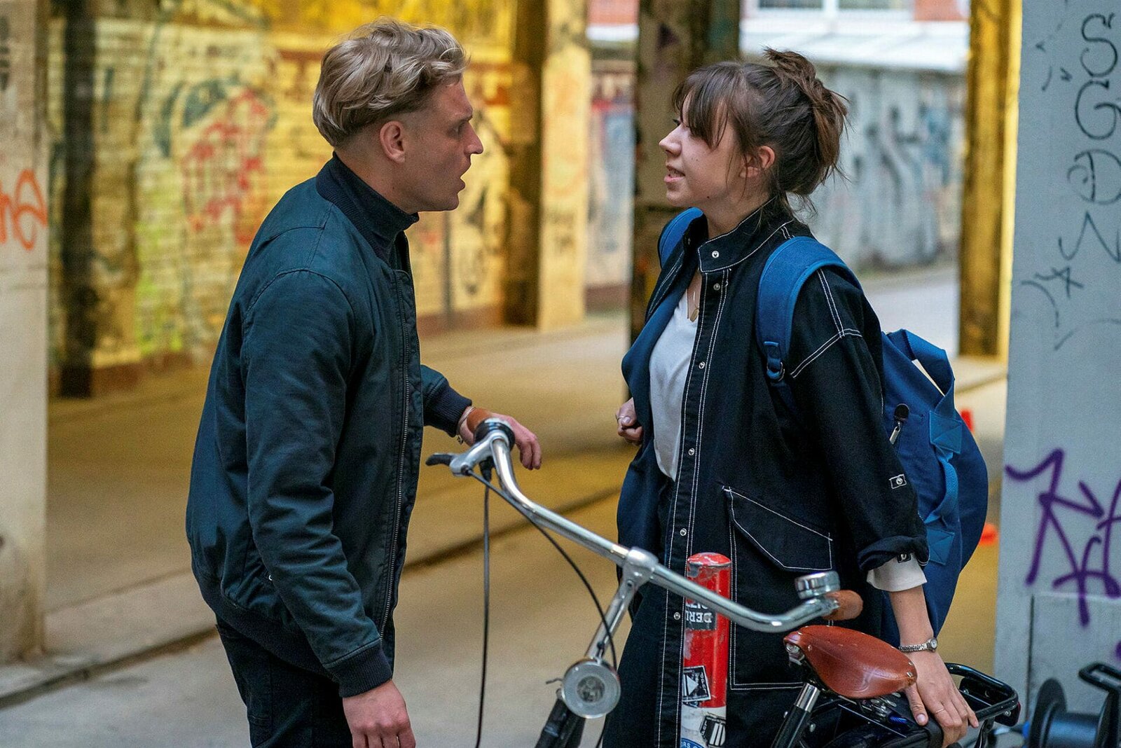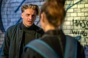 Der letzte TripTill Adamski (Nico Ehrenteit, l.), bietet Lena Purstedt (Darja Mahotkin, r.). an, nach dem Tod ihres Freundes bei ihm unterzukommen. Sie lehnt ab und lässt ihn einfach stehen.Bild: © ZDF und Oliver Feist.