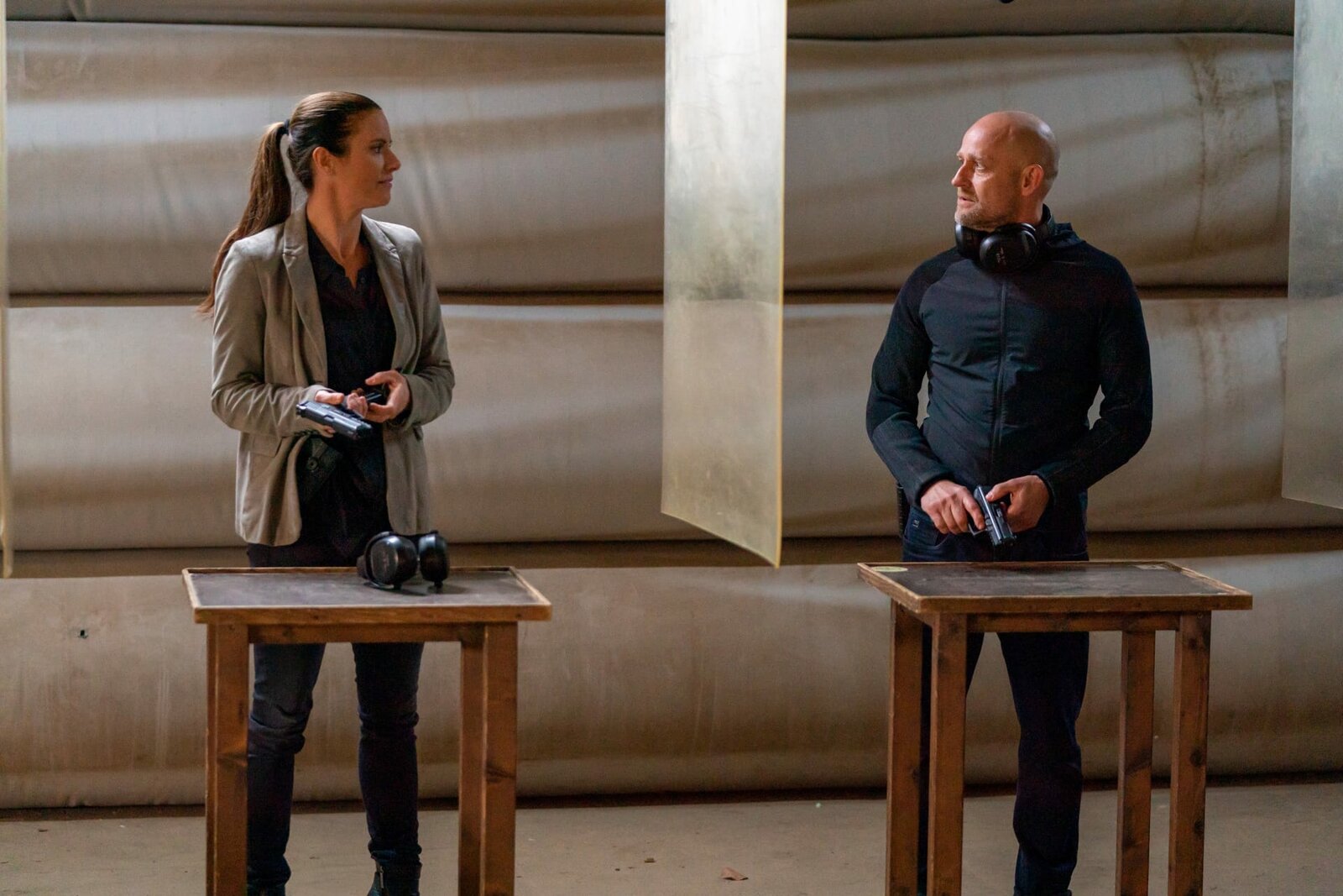 Der letzte TripRobert Heffler (Jürgen Vogel, r.) trifft trifft seine Chefin Katharina Koblinski (Elisabeth Baulitz, r.) am Schießstand und sichert ihr zu, das sie weiterhin auf seine Unterstützung zählen kann.Bild: © ZDF und Oliver Feist.