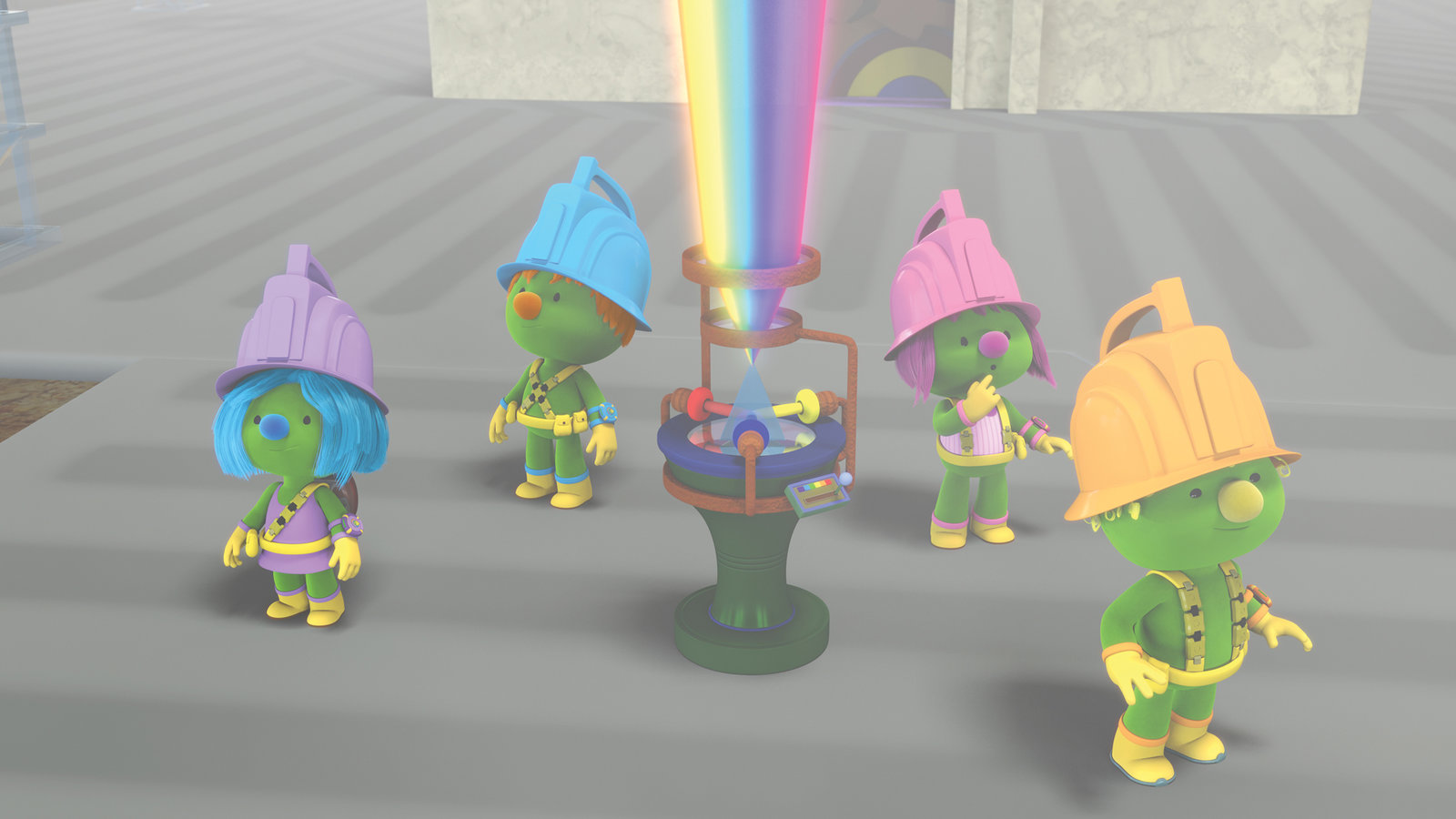 Mission: Durch den NebelDie Tüftler fragen sich, ob Professor Gimbal den Regenbogenwegweiser im Nebel erkennt.Bild: © KiKA/The Jim Henson Company/DHX Media