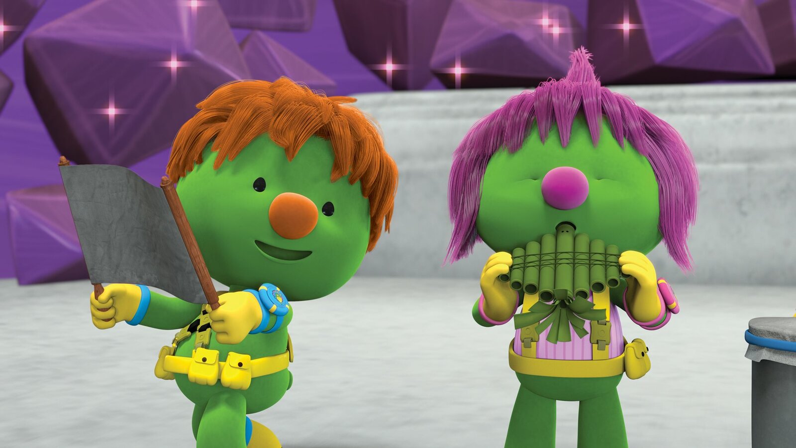 Mission: RadieschenschleuderSpike und Molly musizieren mit ihren selbstgebastelten Instrumenten.Bild: © KiKA/The Jim Henson Company/DHX Media