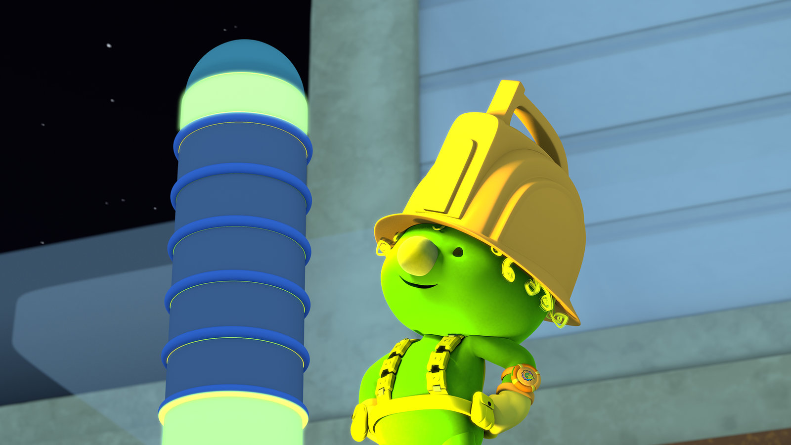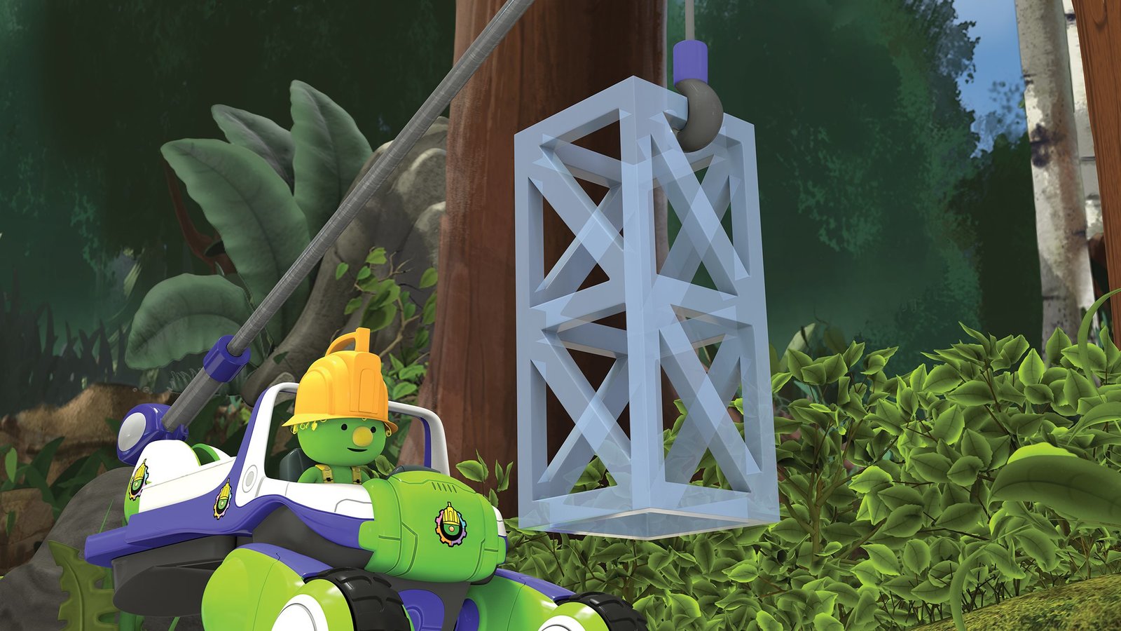 Mission: KlubhausSchon beginnen die Bauarbeiten und Flex transportiert ein Bauteil.Bild: © KiKA/2018 The Jim Henson Company