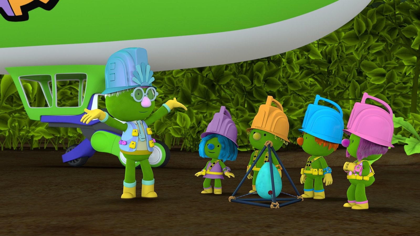 Mission: SchluckaufProfessor Gimbal hat eine Idee, wie die vier Tüftler das Rotkehlchen-Ei auf den Baum transportieren können.ÂBild: © KiKA/The Jim Henson Company/DHX Media