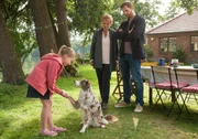 PapakindHildegard (Mariele Millowitsch) und Paul (Christoph Schechinger) beobachten, wie Emma (Martha Haberland) den Kontakt zu Therapiehündin Käthe aufnimmt.Bild: © ARD Degeto/Britta Krehl