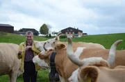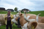 SchweizWir riecht Heimat? Simmentaler Kühe beschnuppern Wladimir Kaminer.Bild: © ZDF und SRF.