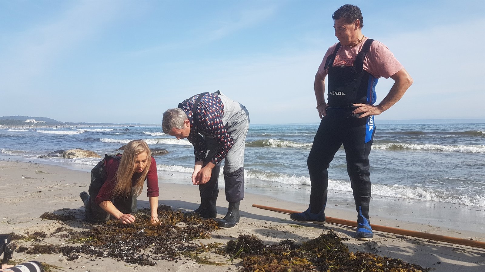 DeutschlandWladimir Kaminer sucht Bernsteine im Kescher auf Rügen mit Tina und Finbarr.Bild: © ZDF und Nadja Kölling.