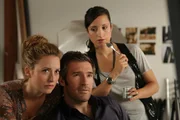 Harriets TraumAngie (Stephanie Stumph, r.) ist eifersüchtig auf Harriet Devonshire (Wanda Colombina, l.) und nicht erfreut, dass Leo Purbright (Ben Braun, M.) Harriet so in die Arbeit mit einbezieht.Bild: © ZDF und Meinolf Schmitz./Meinolf Schmitz